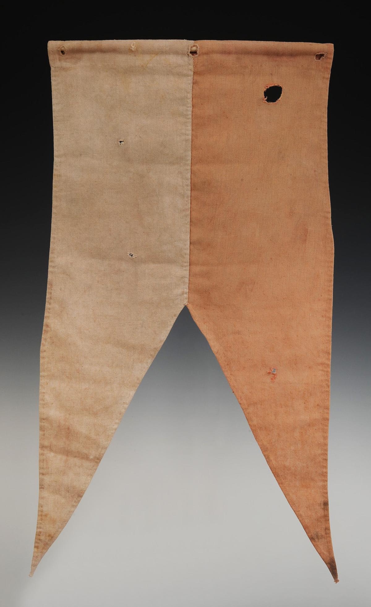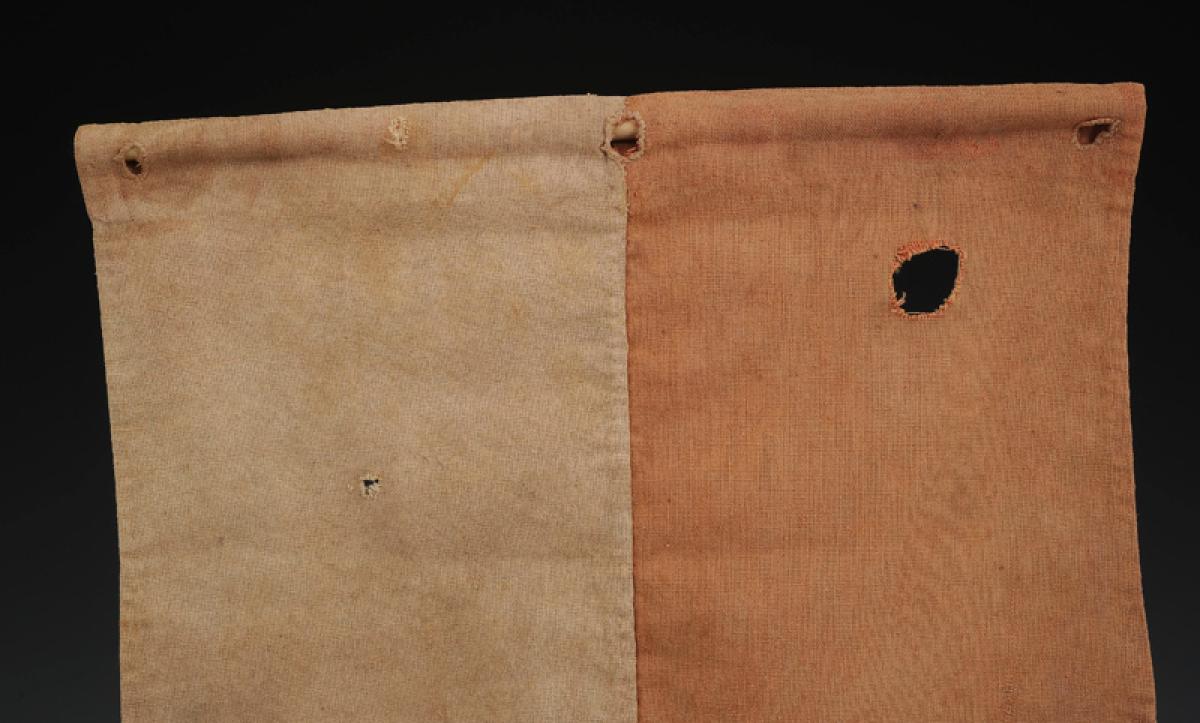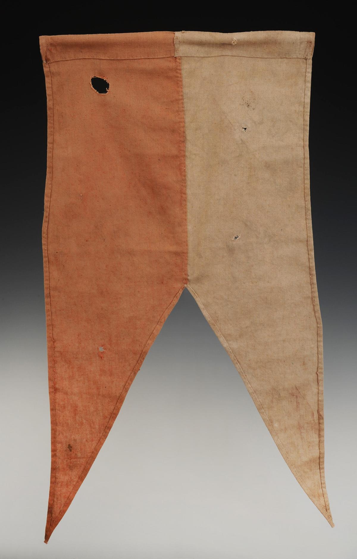 Serge flame composed of two bands of different colors, each 20 cm high: white upper band, scarlet lower band. It is double-pointed; the upper and lower parts are cut straight and measure 71 cm in length (the dimension given in the regulatory text of Bardin in 1812 is 67 cm); measured at the junction of the two colors, from the base of the points, it measures 40.5 cm (the regulatory text of Bardin in 1812 gives 37.5 cm) in length, the opposite side of the points is folded over by 3.5 cm and pierced with three eyelets (the BARDIN regulation mentions "a 2 cm wide leather strip, covered in canvas, and pierced with three eyelets). H 40 cm; width 74 cm.