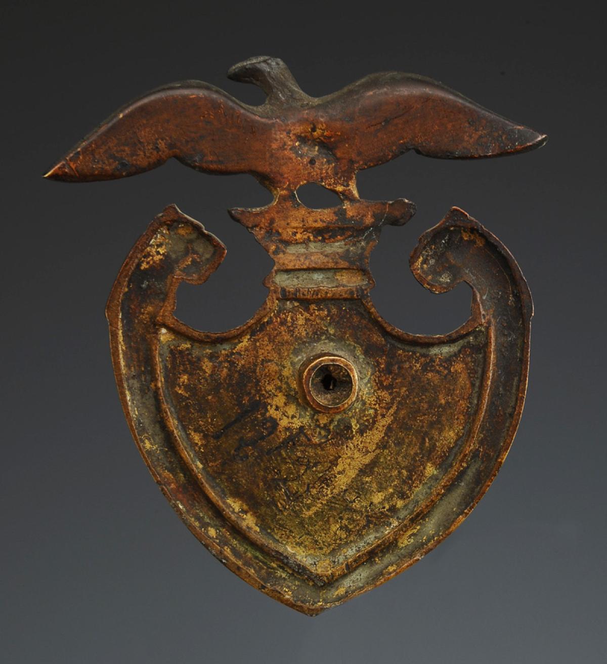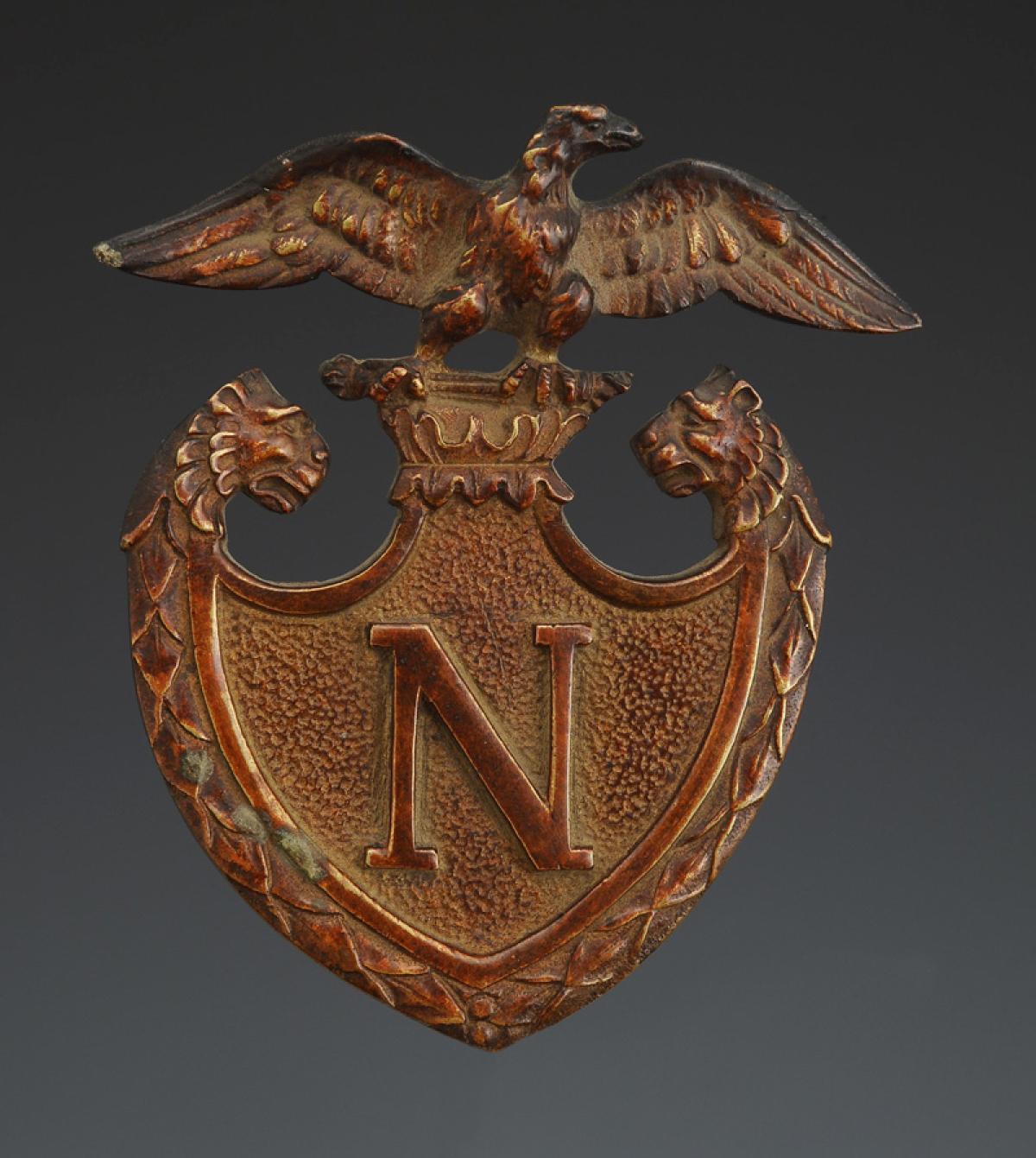 Cast brass plate depicting an uncrowned imperial eagle with outstretched wings, resting on a shield decorated with an "N" bordered at the bottom by laurel branches and on either side by a lion's head. Rear attachment via a threaded screw. Dimensions: Height 10.2 cm, Width 9 cm.