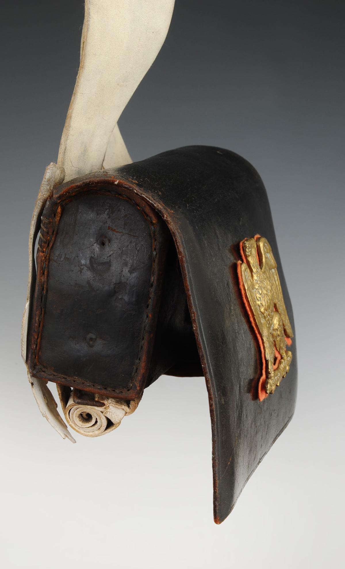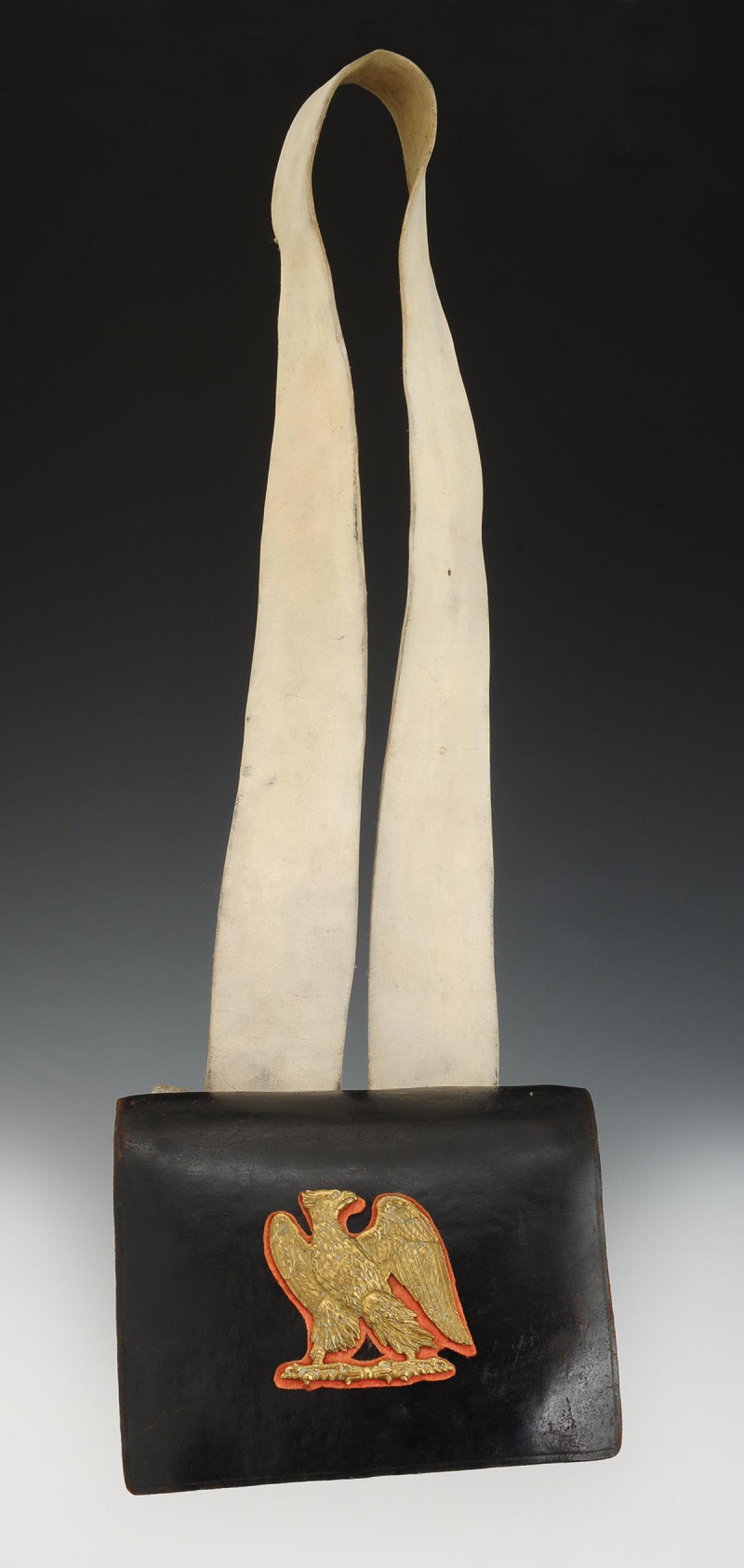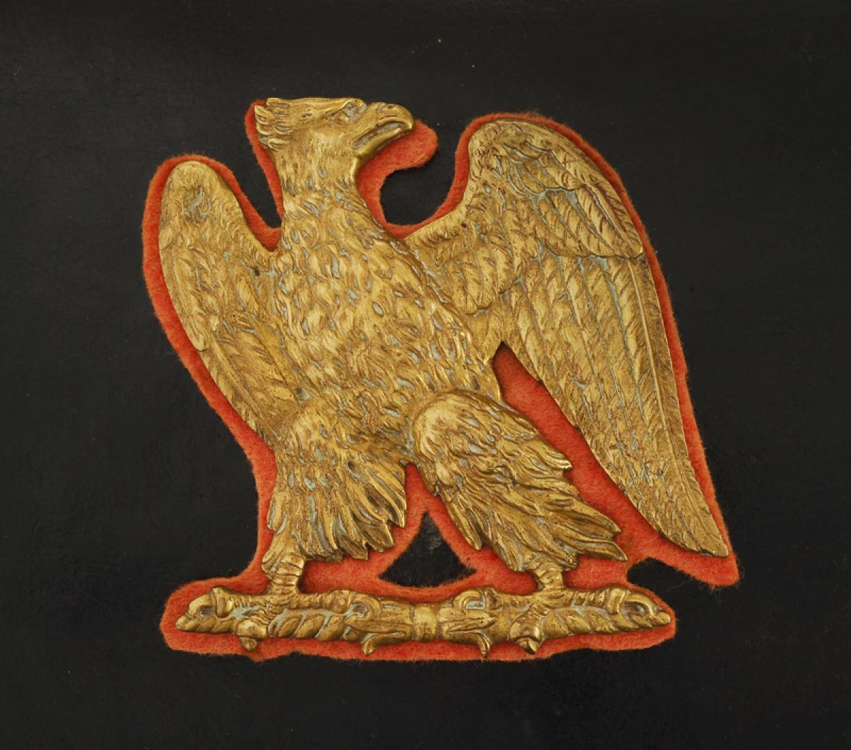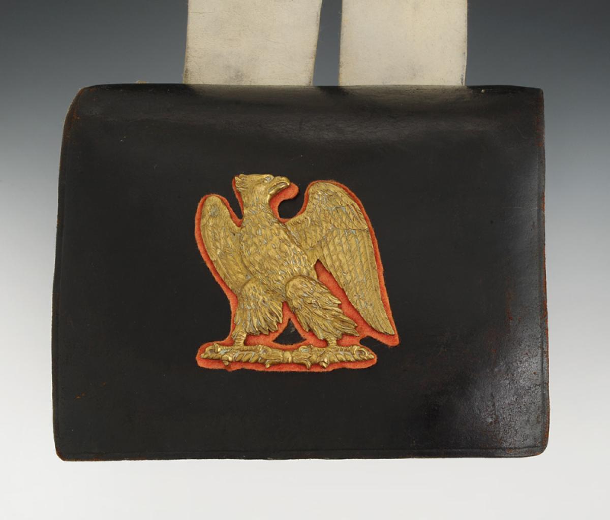 Black varnished cow leather strap adorned with an uncrowned eagle with spread wings holding the lightning bolt of Jupiter in cast brass, height of the eagle 9.7 cm, width 9.5 cm; it is attached to the strap by four rear hooks; it is lined with scarlet cloth.