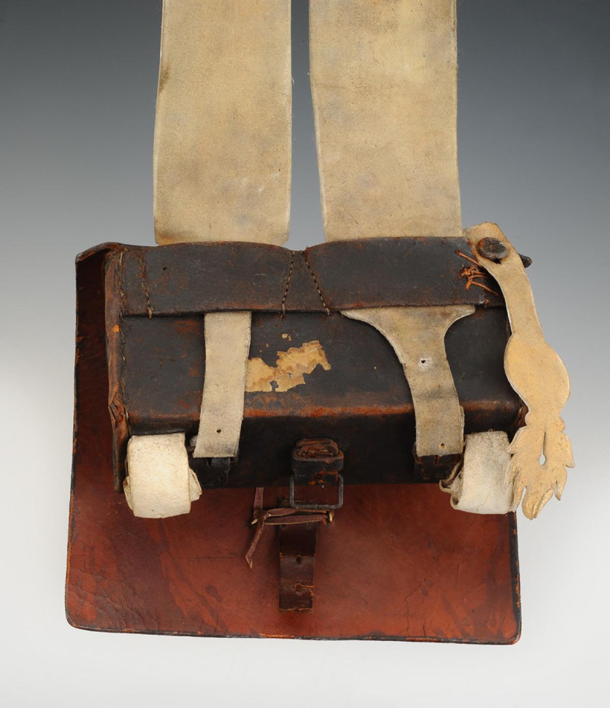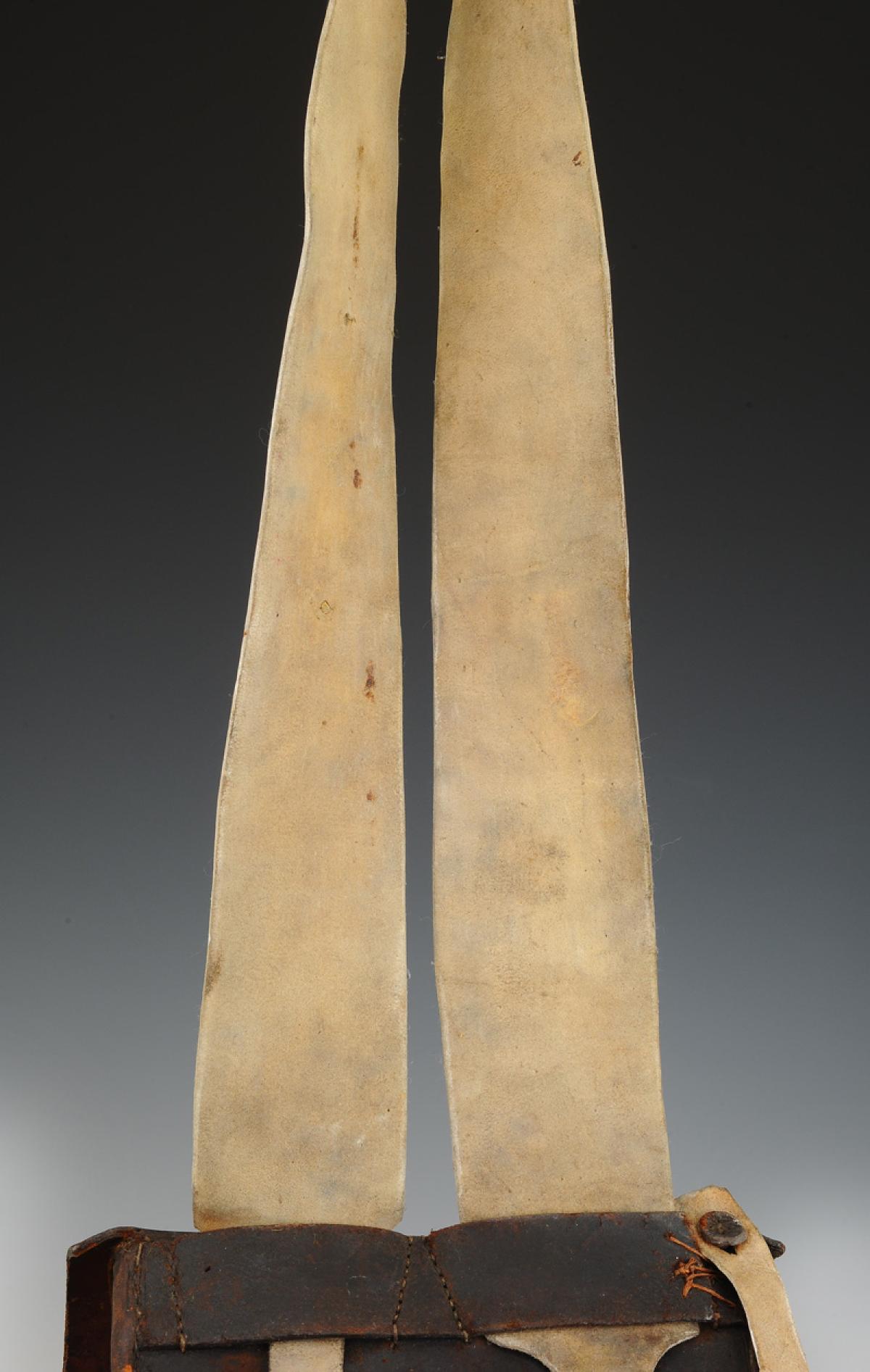 The back of the case has two wide tabs for the passage of the sash. At the top, a button is sewn to attach the martingale made of whitened buffalo leather cut in the shape of a flaming bomb.