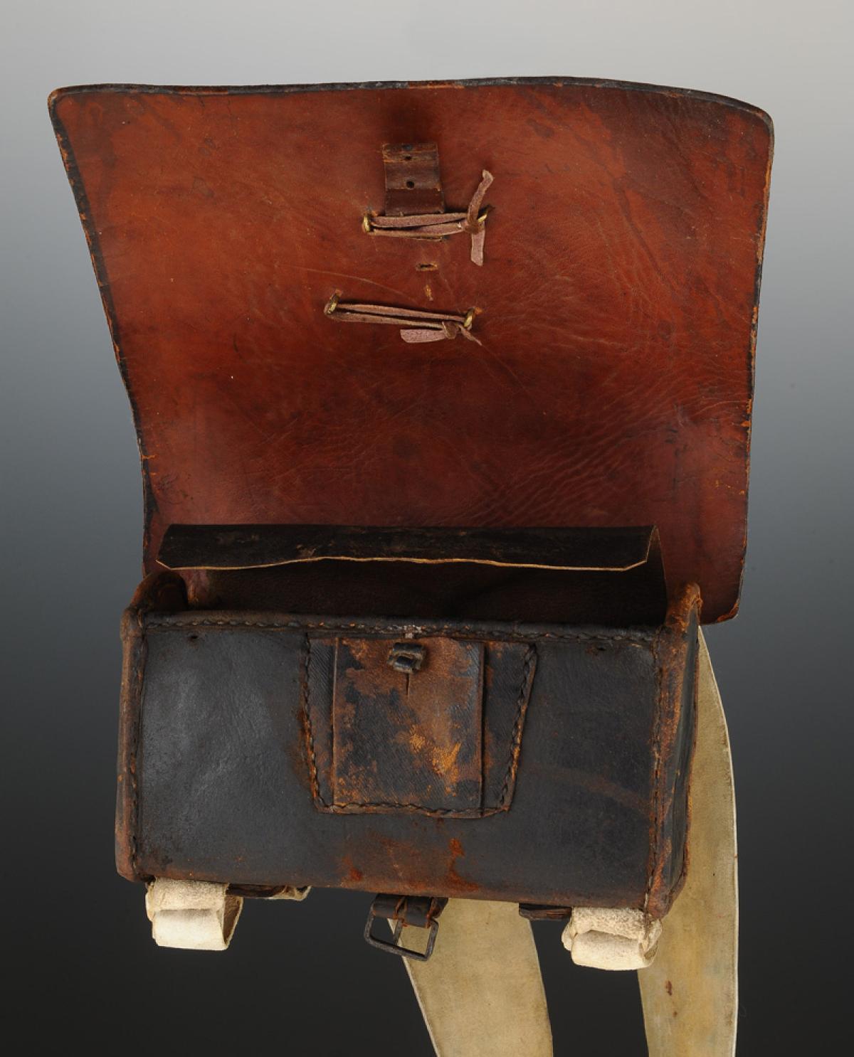Black waxed leather case, length 21.5 cm, height 12 cm, depth 7.8 cm, with a wooden core with two hollowed side compartments and a central compartment intended for 6 cartridges. Soft leather flap on top. At the front, a small pocket closing with a rolled leather button. Three rectangular steel loops with one prong are sewn below, one to attach the strap, the two side ones to secure the shoulder strap; at each end, below, a whitened calf leather strap is sewn and finished with a steel buckle (strap width 2.7 cm).