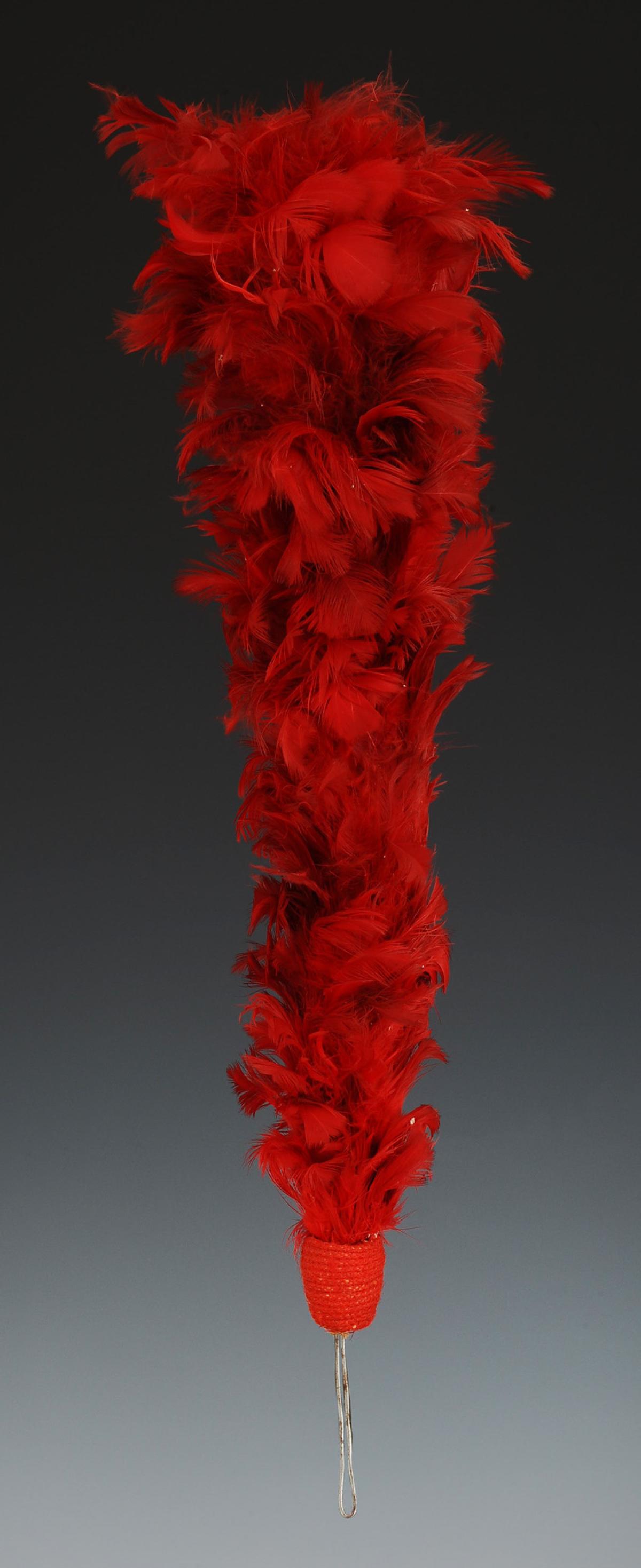 In scarlet cock feathers, H 30 cm, mounted on a metal rod. Total H 37 cm.