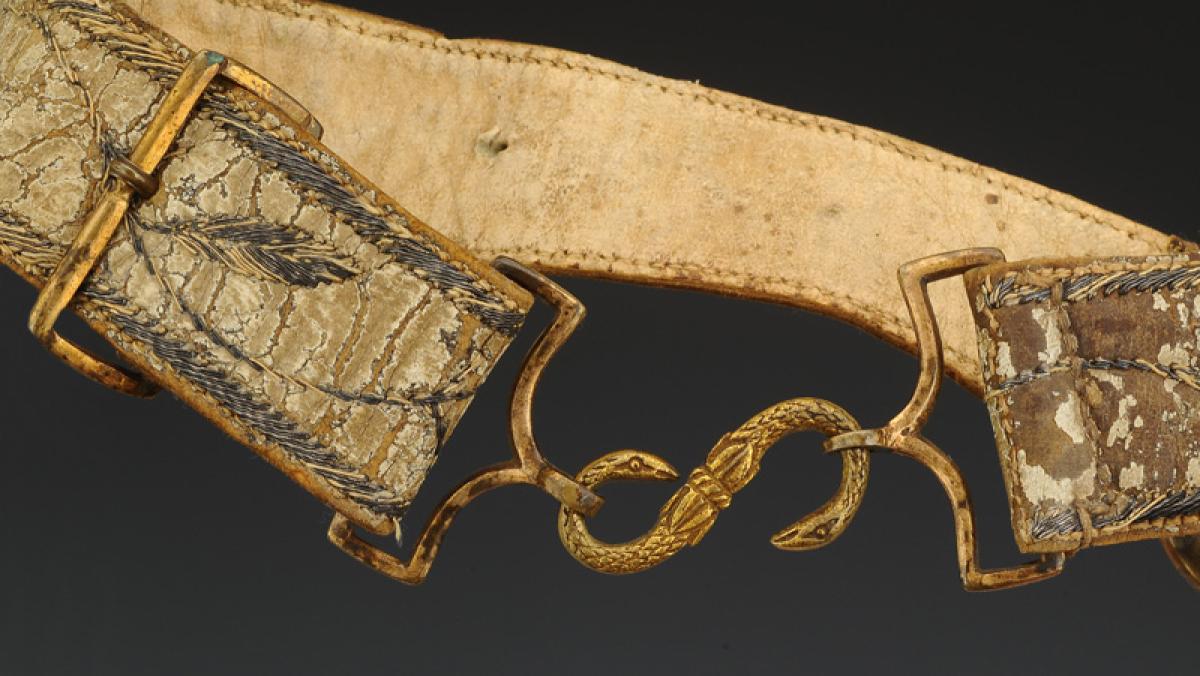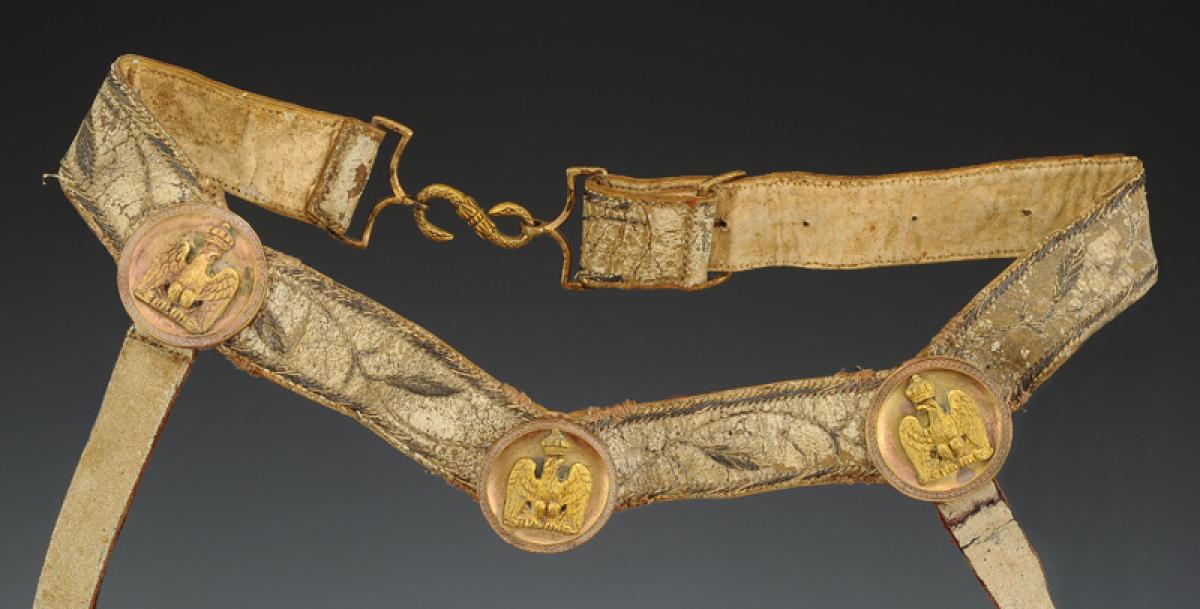 Belt made of white lacquered leather, entirely embroidered in silver-gilt threads with laurel leaves, 3.7 cm wide. It consists of four parts connected by three round gilded copper buckles, Ø 4.6 cm, with geometric decorative motifs and a center featuring an applied imperial eagle. The belt closes at the front with rectangular buckles, height 4.3 cm, width 2.5 cm, connected by an S-shaped hook with snake heads.