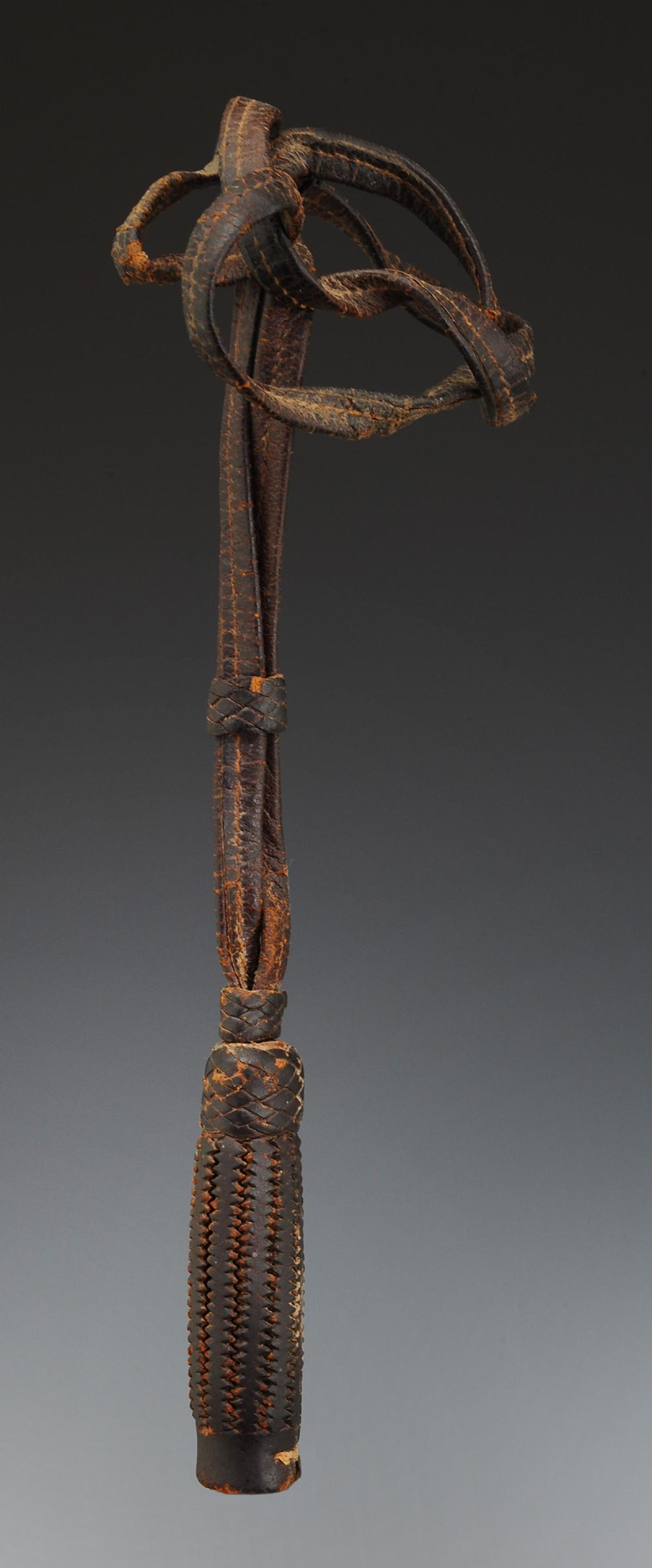 Made of cowhide leather, consisting of a tassel made of a thin piece of leather rolled and cut into strips, a slider, and a strap.