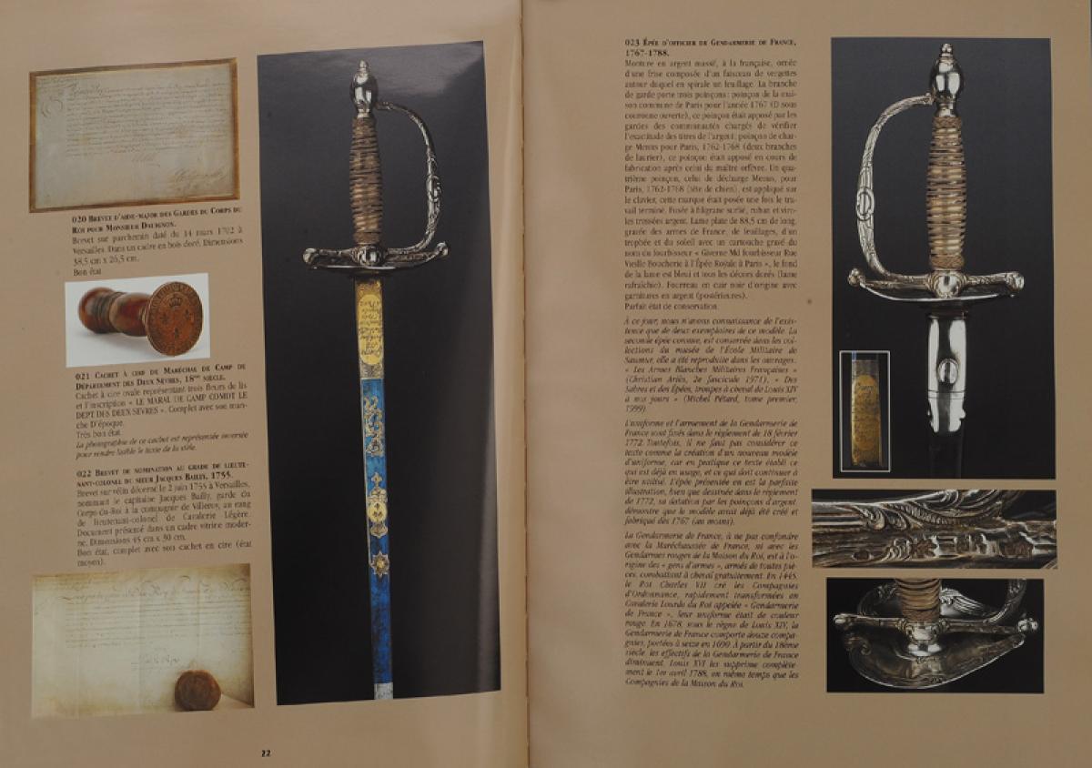 This catalog is the result of fifteen years of professional experience and twenty-five years of passion for military art. Its purpose is not to gather extraordinary and extremely rare objects; rather, the work consists of a selection of military items and authentic historical mementos representative of the armies of the past centuries. Like the History of France, these objects bear witness to a past rich in events: glorious, unfortunate, lavish, modest, exceptional, or ordinary... It is a privileged means to observe History through Objects and to acquire them if such is your desire. Through nine chapters: the Ancient Monarchy, the Revolution, the First Empire, The First Restoration, the Hundred Days, the Second Restoration, the July Monarchy and the Second Republic, the Second Empire, and the Third Republic, the reader is given a historical synthesis of the period studied and the role of the army at that time. This catalog presents approximately 330 military souvenirs and over 800 uniform buttons distributed in each chapter, with descriptions of various military objects, all photographed in color and sometimes accompanied by historical notes depending on their rarity.