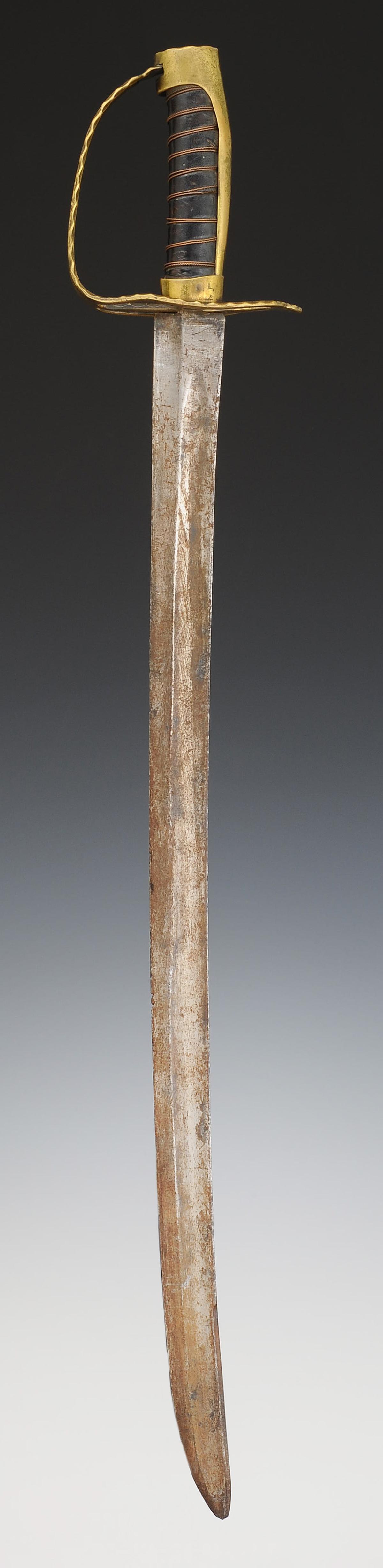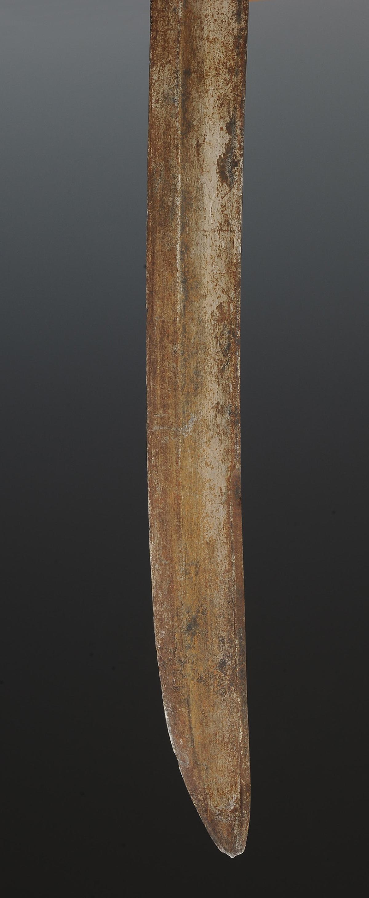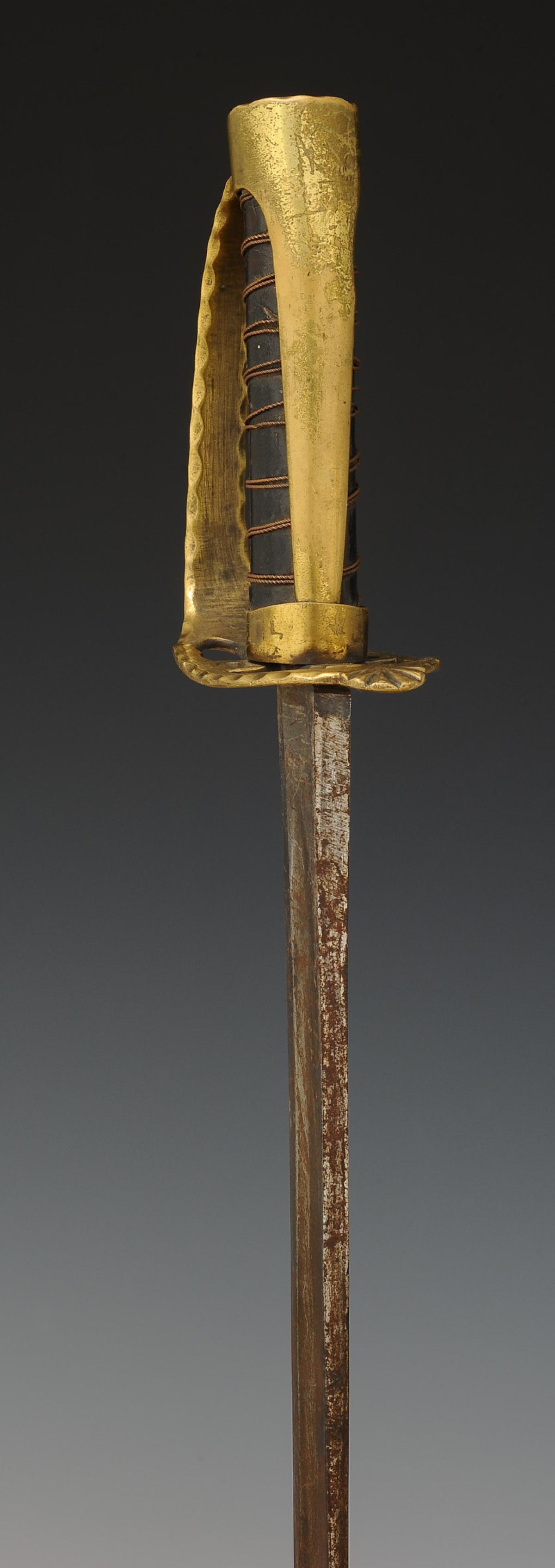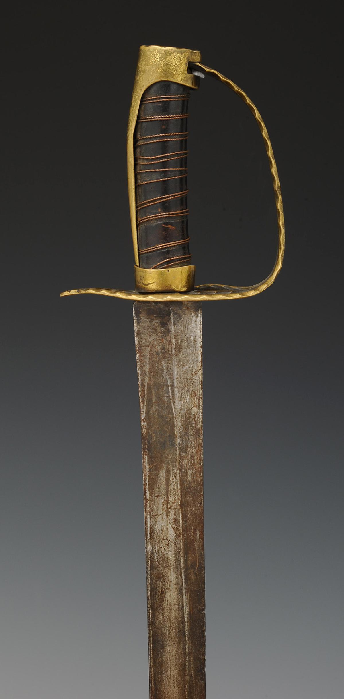Brass hilt. Single-branch guard. Pierced plate with scalloped edges. Pommel with a long tail. Wooden handle covered in black waxed calfskin, copper wire filigree. Brass ferrule. Slightly curved white blade with hollow facets, 3.5 cm width at the base, 1 cm thickness, 61 cm length.