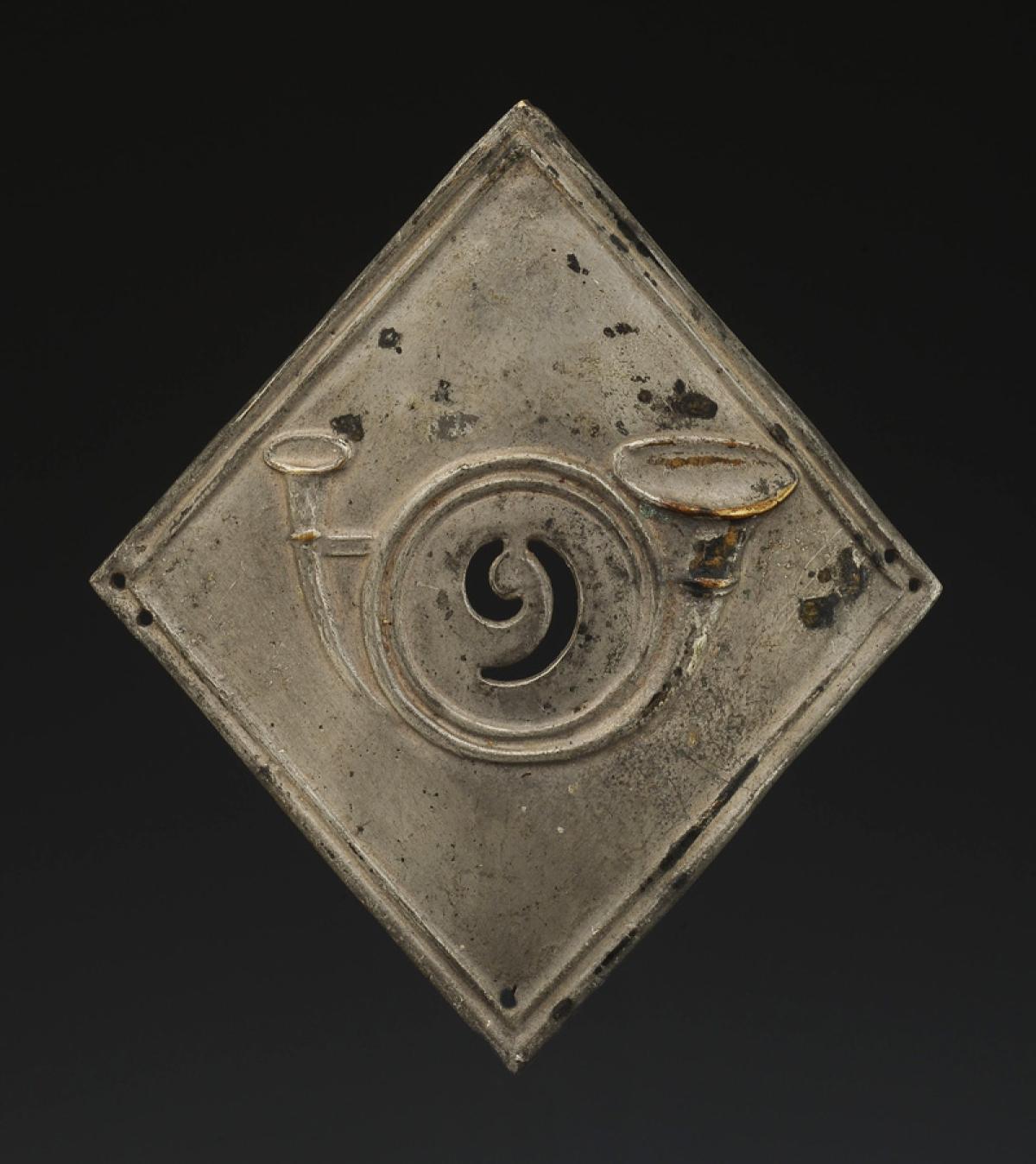 Lozenge-shaped, H 10.8 cm x 9.6 cm. Made of tinned brass, stamped with a hunting horn with the center cut out in the shape of the number "9". Raised decorative border. Back lined with tin. Each corner has fixing holes.