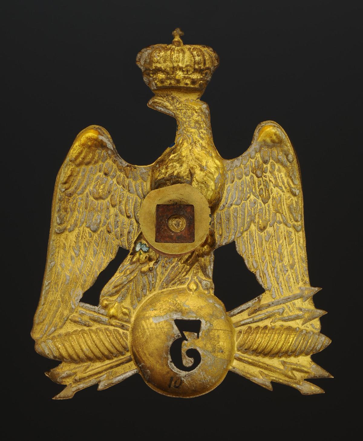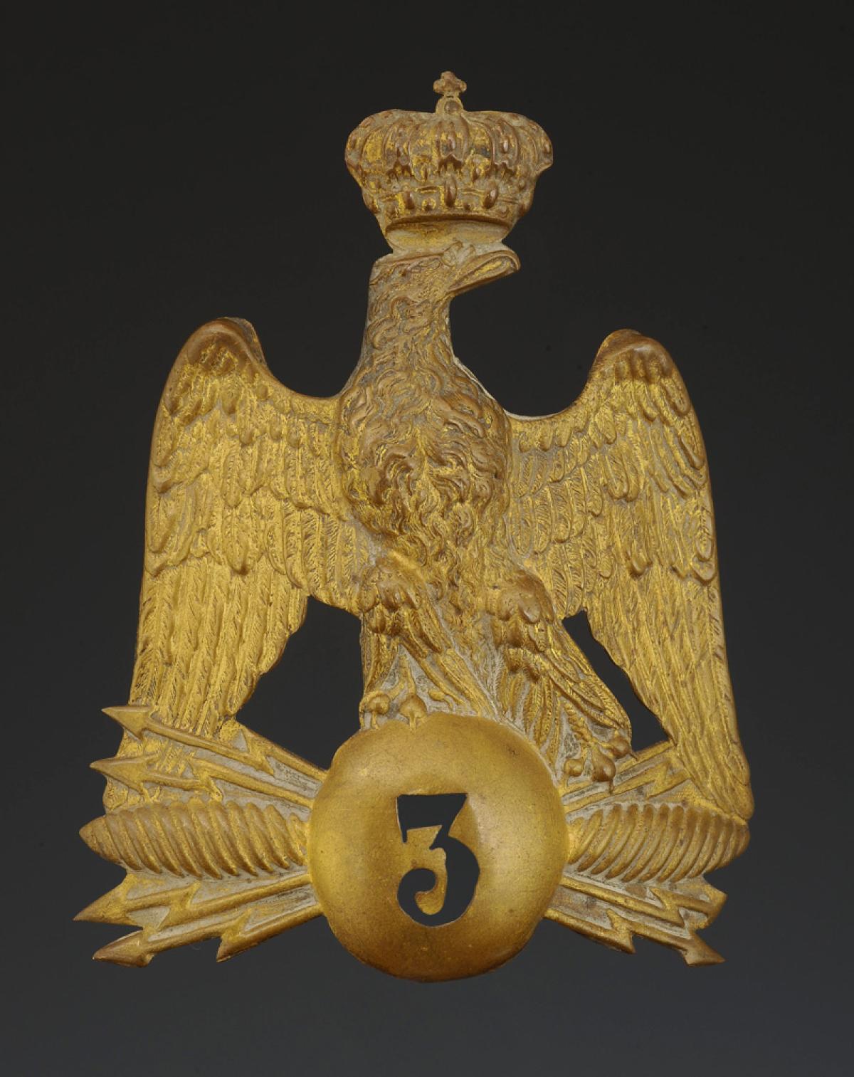 Stamped and cut brass in the shape of a crowned eagle with outspread wings resting on a globe cut in the shape of the number "3", holding the sparkling lightning bolt of Jupiter in its talons, H 11.3 cm, width 8.5 cm. Complete with its screw and nut.