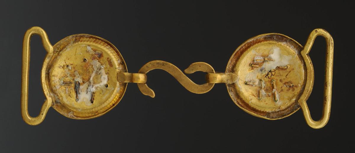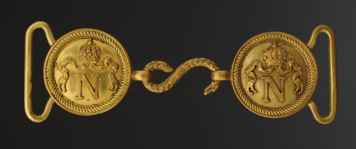 Consisting of two fully brass-gilt round buckles, measuring 4.2 cm in diameter, decorated in the center with an "N" and an imperial crown attached. The buckles are connected by an S-shaped hook depicting two snakes. Ivory calf lining.