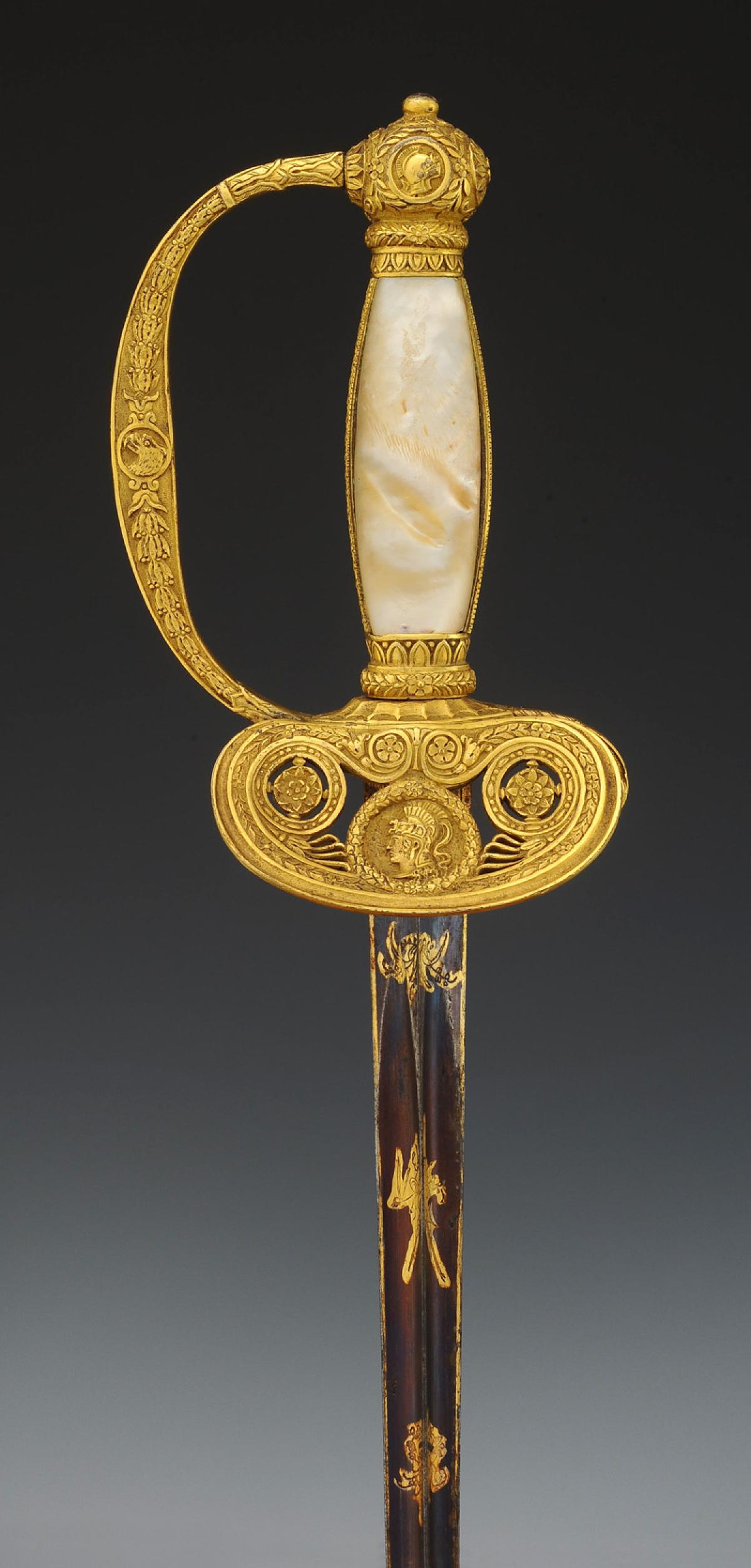 Gilt bronze hilt finely cast and chiseled in the style of Nicola Boutet's models. Guard with one branch decorated with laurel leaves and an eagle head in a medallion on each side. Curved quillon embellished with a flower. Shield-shaped openwork knucklebow decorated with a helmeted Minerva head surrounded by a laurel crown, with water and floral motifs on either side. The knucklebow is bordered with a laurel leaf and flower molding. Quadrilobed pommel decorated with an owl, an ancient helmet, and flowers. Wooden handle with mother-of-pearl plates and gilt brass side bars with oak branches. Ferrules adorned with water leaves and laurel branches. Triangular blade signed "IGB," engraved and gilded on its first third with military trophies, floral motifs, a civic crown, on a blued background, length 86.1 cm. Remnant of scarlet cloth attachment.