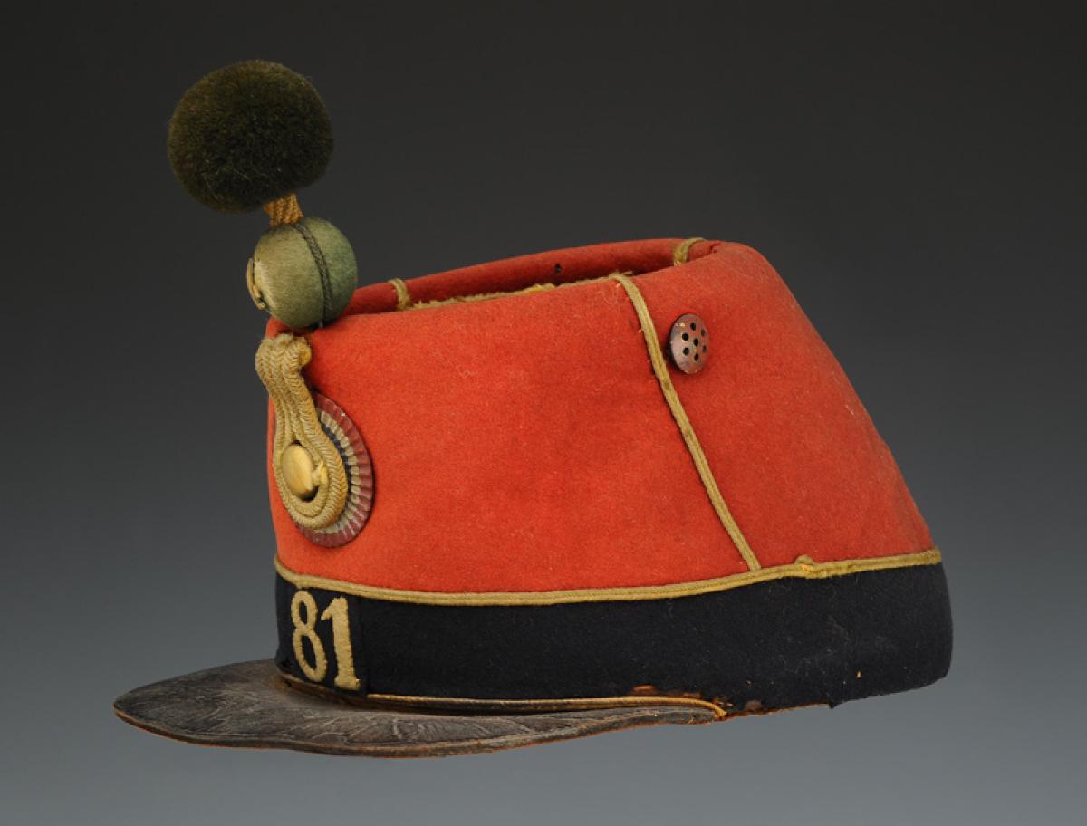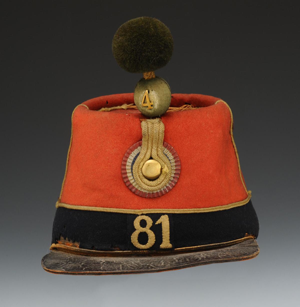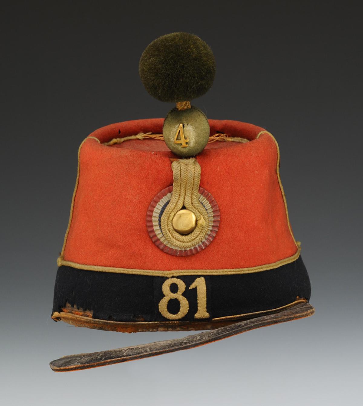 Band sewn at the bottom of the turban, in dark blue cloth in one piece, height 4.5 cm, bordered at the top with a jonquil wool cord, as well as at the bottom at the level of the visor. At the front of the band is sewn a piece of dark blue cloth embroidered with the number "81" in jonquil wool, height 2.7 cm, the seams are stitched with silk thread. Square-shaped visor in heavy cowhide, width 4.5 cm. Relief-stamped white iron cockade, tricolored, diameter 4.5 cm. In the center of the cockade there is a hole where the button tail is inserted and soldered inside the cockade. Cockade braid made up of two strands of jonquil square braid, 4mm thick, doubled around the button tail. The four strands together have a width of 1.6 cm and are tucked between the turban and the gusset. Button in copper tomback, flattened half-spherical, diameter 1.4 cm.