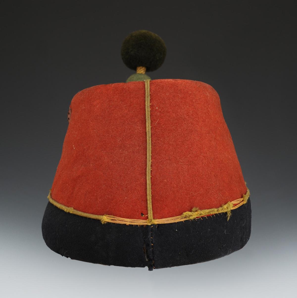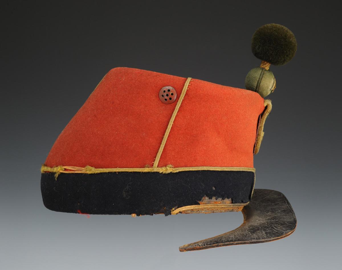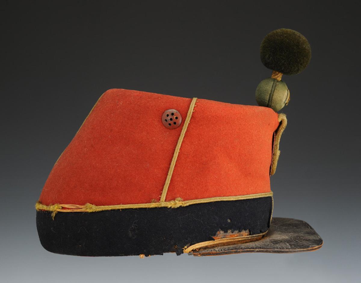 Band sewn at the bottom of the turban, in dark blue cloth in one piece, height 4.5 cm, bordered at the top with a jonquil wool cord, as well as at the bottom at the level of the visor. At the front of the band is sewn a piece of dark blue cloth embroidered with the number "81" in jonquil wool, height 2.7 cm, the seams are stitched with silk thread. Square-shaped visor in heavy cowhide, width 4.5 cm. Relief-stamped white iron cockade, tricolored, diameter 4.5 cm. In the center of the cockade there is a hole where the button tail is inserted and soldered inside the cockade. Cockade braid made up of two strands of jonquil square braid, 4mm thick, doubled around the button tail. The four strands together have a width of 1.6 cm and are tucked between the turban and the gusset. Button in copper tomback, flattened half-spherical, diameter 1.4 cm.