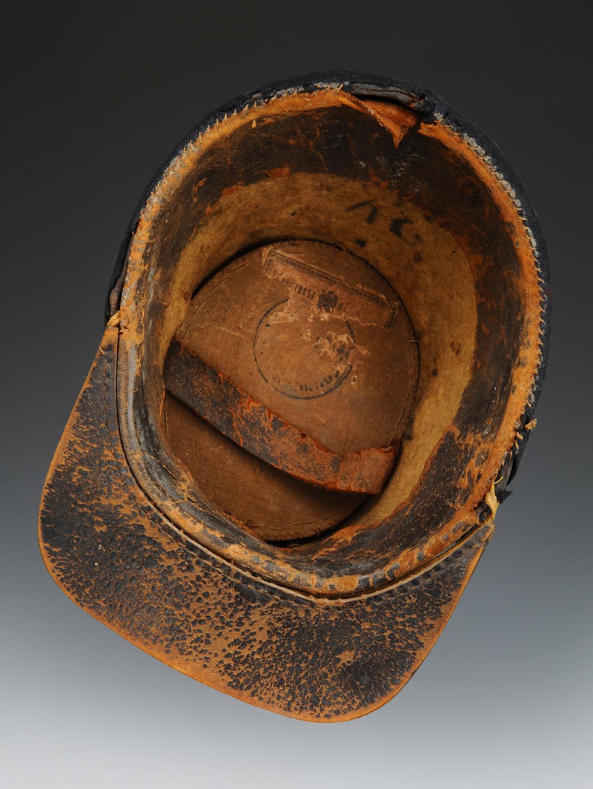 Interior lining composed of a leather headband, paper label glued to the bottom of the cap showing the number 81 of the regiment.