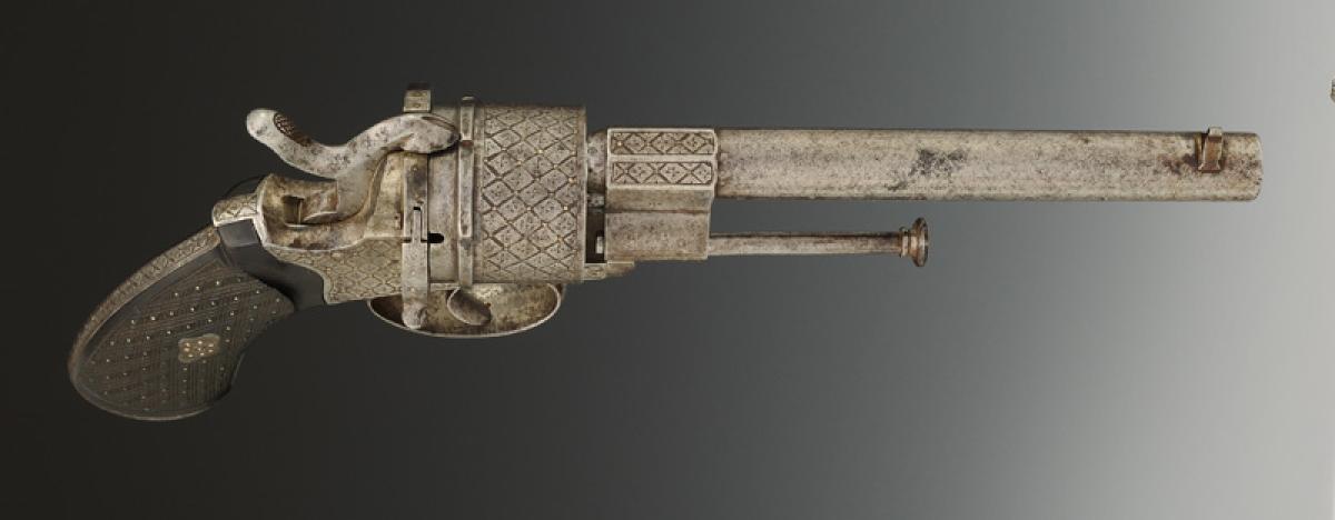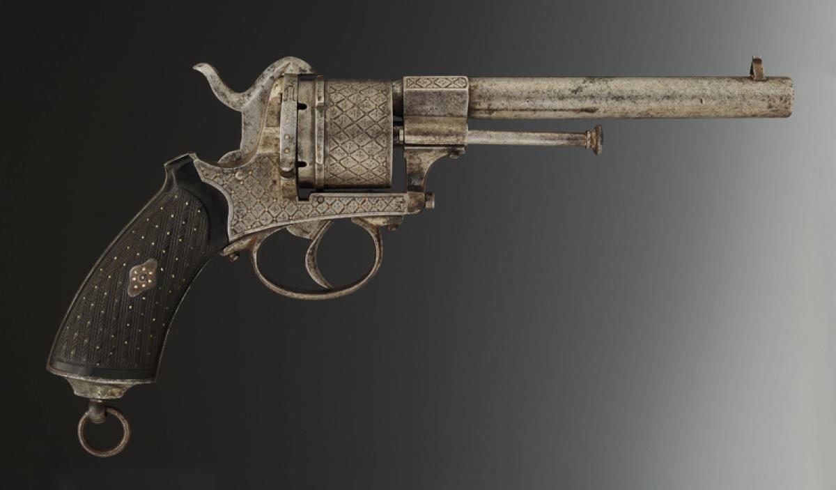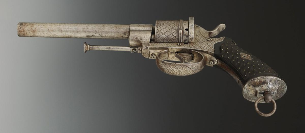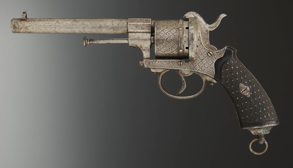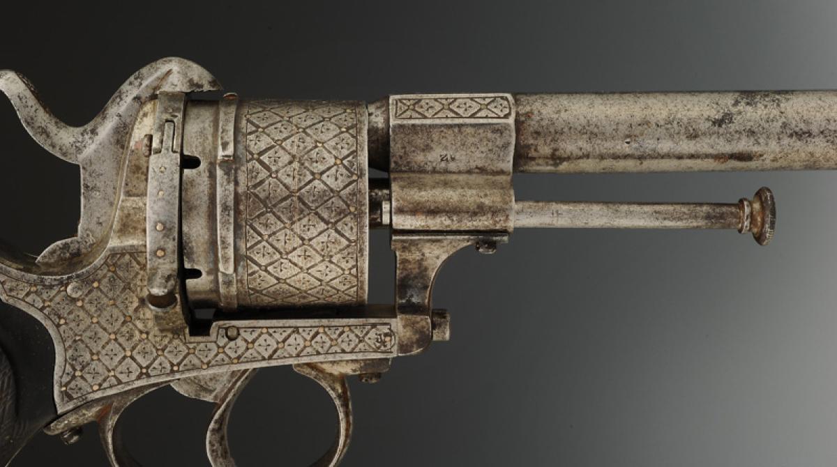 Round barrel, length 15.2 cm, 9 mm pinfire caliber. Frame engraved with a grid of fleur-de-lis patterns, with brass stud decoration. Six-chambered pinfire cylinder, barrel locked by a tenon key. Hinged chamber opening. Matching decoration on the cylinder and frame. Ebony grip panels finely checkered with a sprinkling of steel nails. All steel fittings, butt cap with suspension ring.