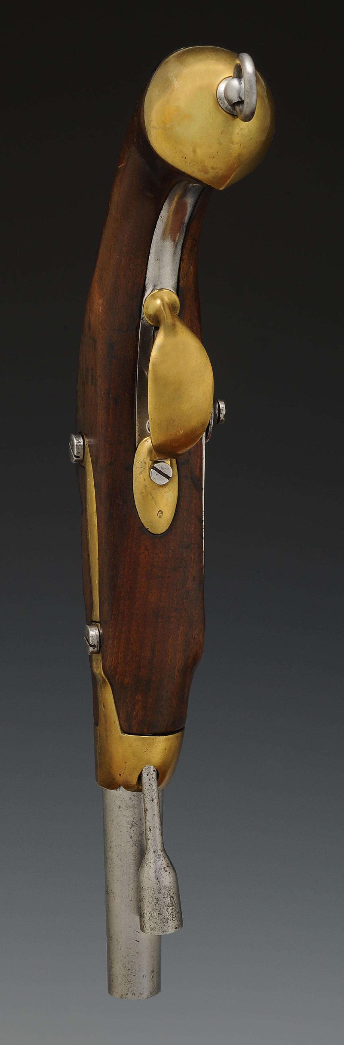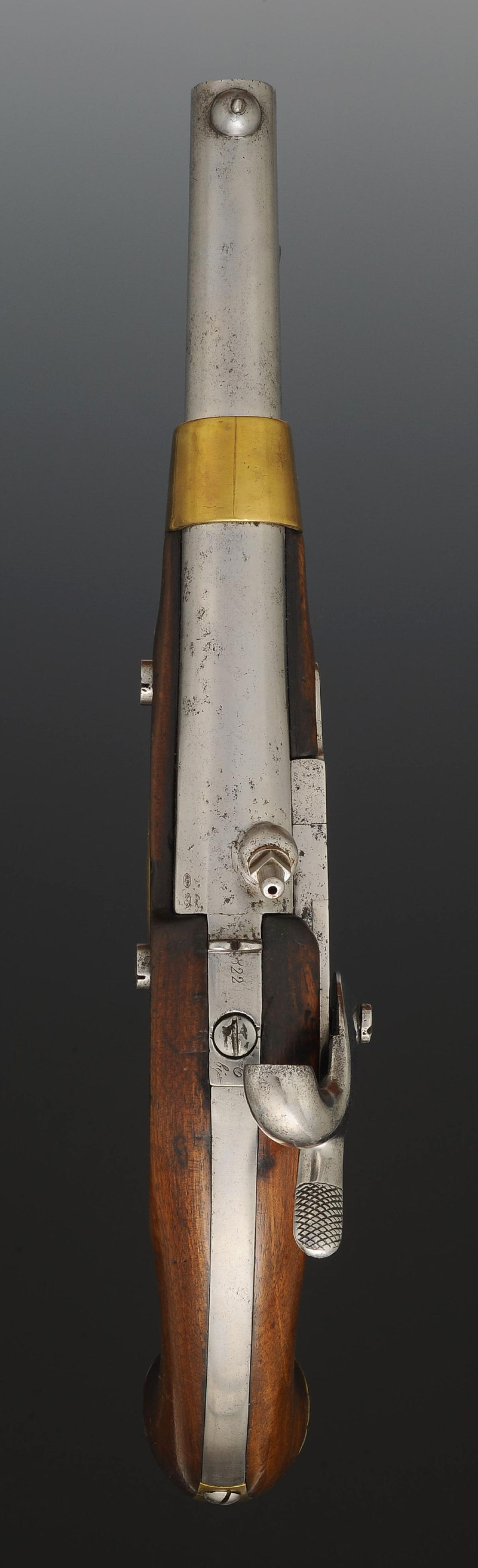 Percussion pistol. Five-sided short barrel marked "88", stamped "M". Barrel length 19.8 cm, length with the breech 23.6 cm. Breech engraved "1822 Tbis". Walnut stock with slightly slanted grip, serialized like the barrel "88". Brass fittings. Steel ring cap, iron trigger guard. Percussion lock plate stamped (illegible) and signed "Royal Manufacture of Charleville". Model ramrod.