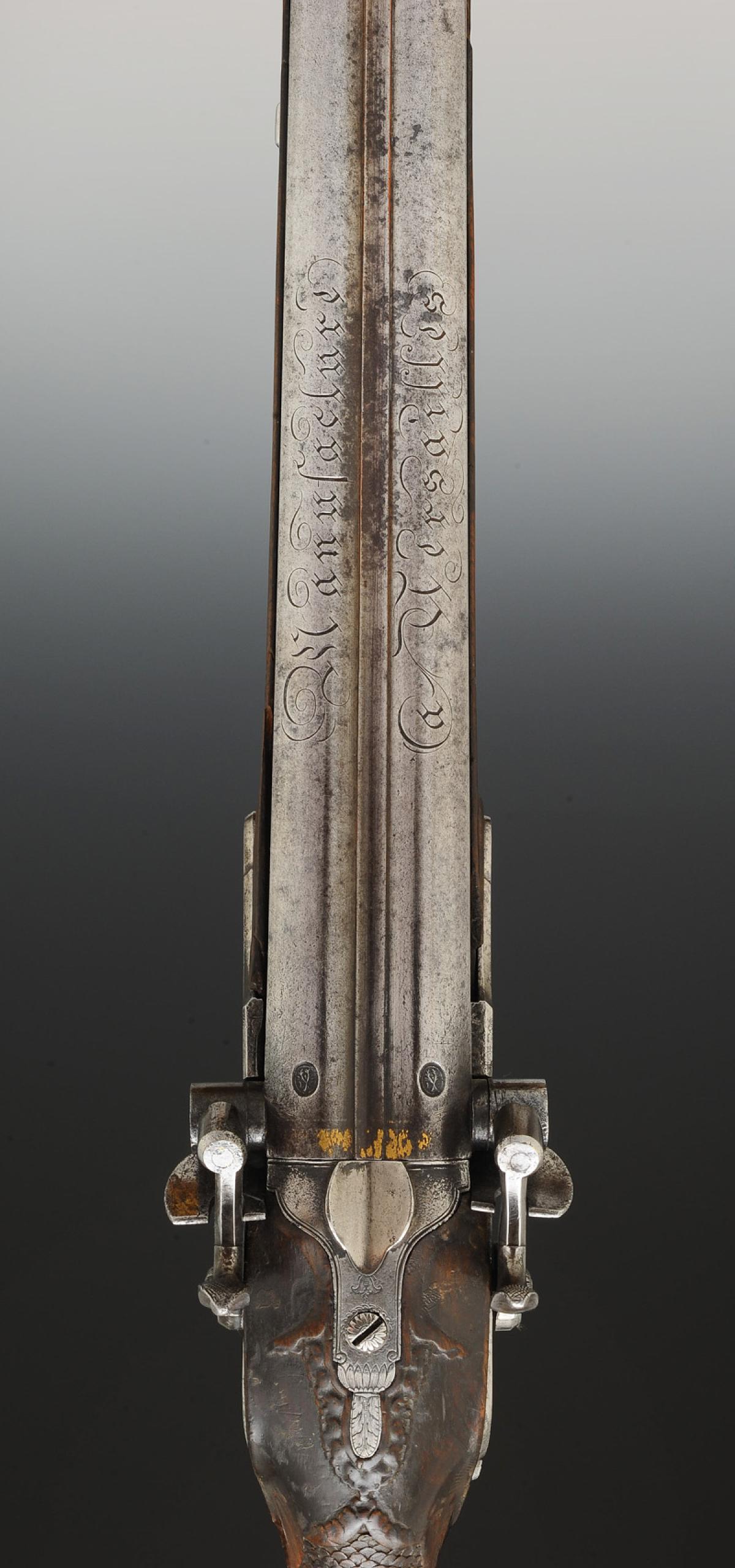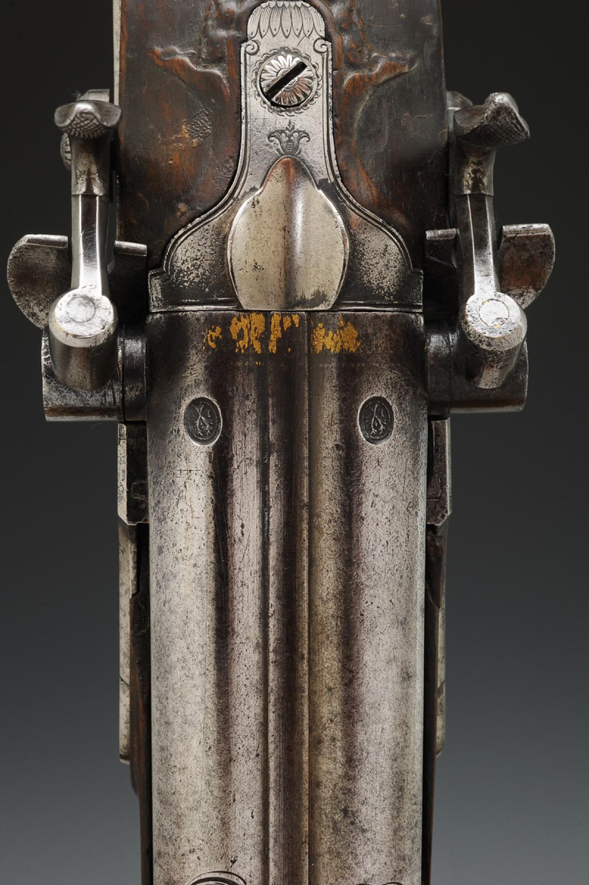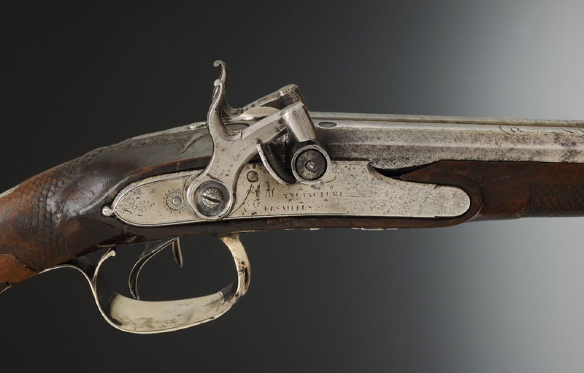 Double side-by-side barrels, initially flat at the breech then round, measuring 79.4 cm in length, 85.5 cm with the breech tail. Engraved on top "Manufacture / Versailles," with an oval hallmark featuring two crossed laurel branches. Flat-bodied percussion locks. Flat-bodied locks converted to percussion, both signed "Manufacture de Versailles." Smooth silver thumb piece. All silver fittings engraved and cut with floral motifs. Marked under-guard "G B" in a diamond shape, with an elderly head and an octagonal stamp containing the number "3" and a rooster. Similarly hallmarked silver butt plate as the under-guard.