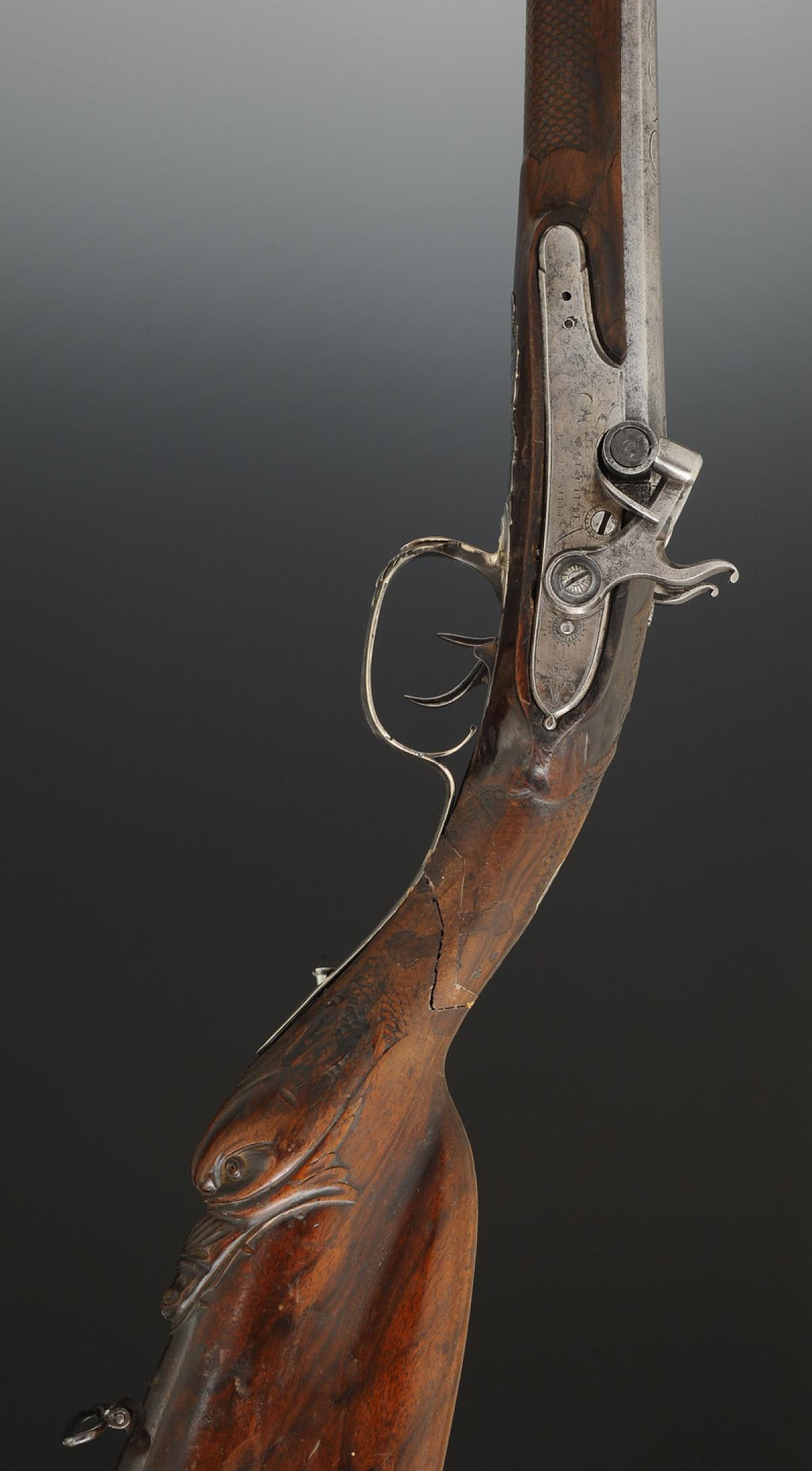 Walnut stock, finely checkered and sculpted hand grips with a monster head under the butt.