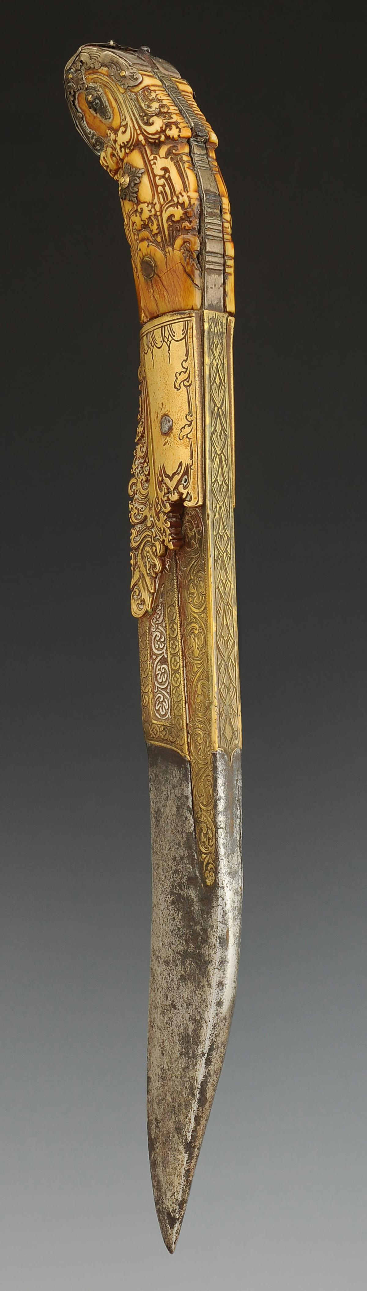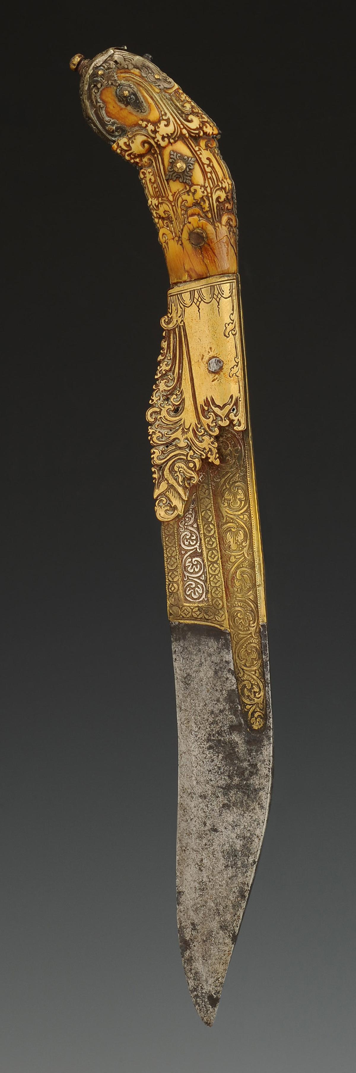 Handle with carved horn plates depicting floral scrolls, with silver metal fittings. Steel blade with brass inlay decoration depicting flowers in scrolls. Length of the blade 23.2 cm, total length of the dagger 31.1 cm.