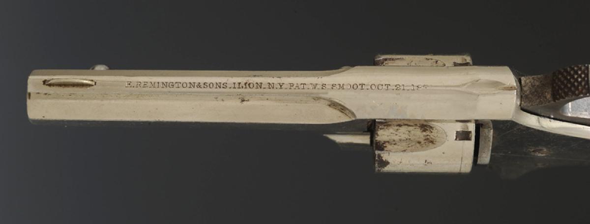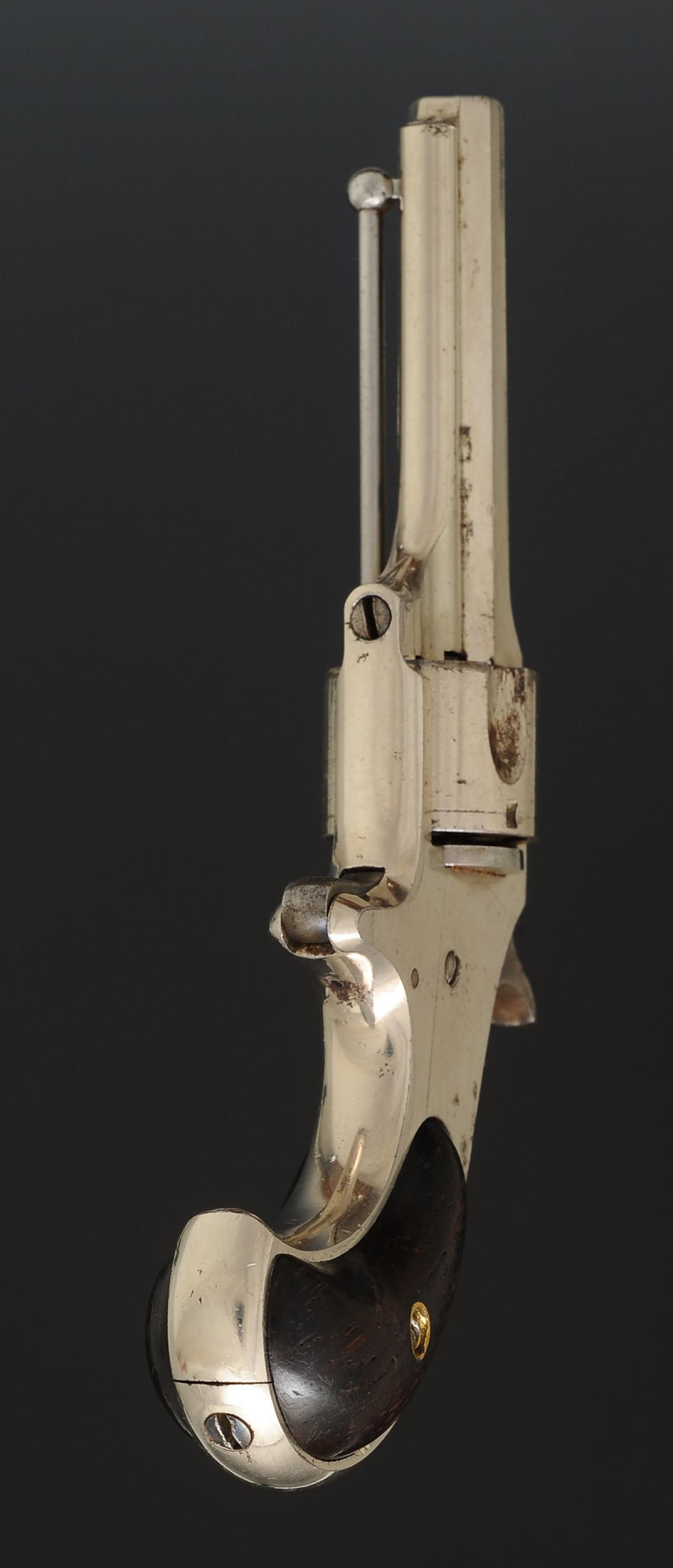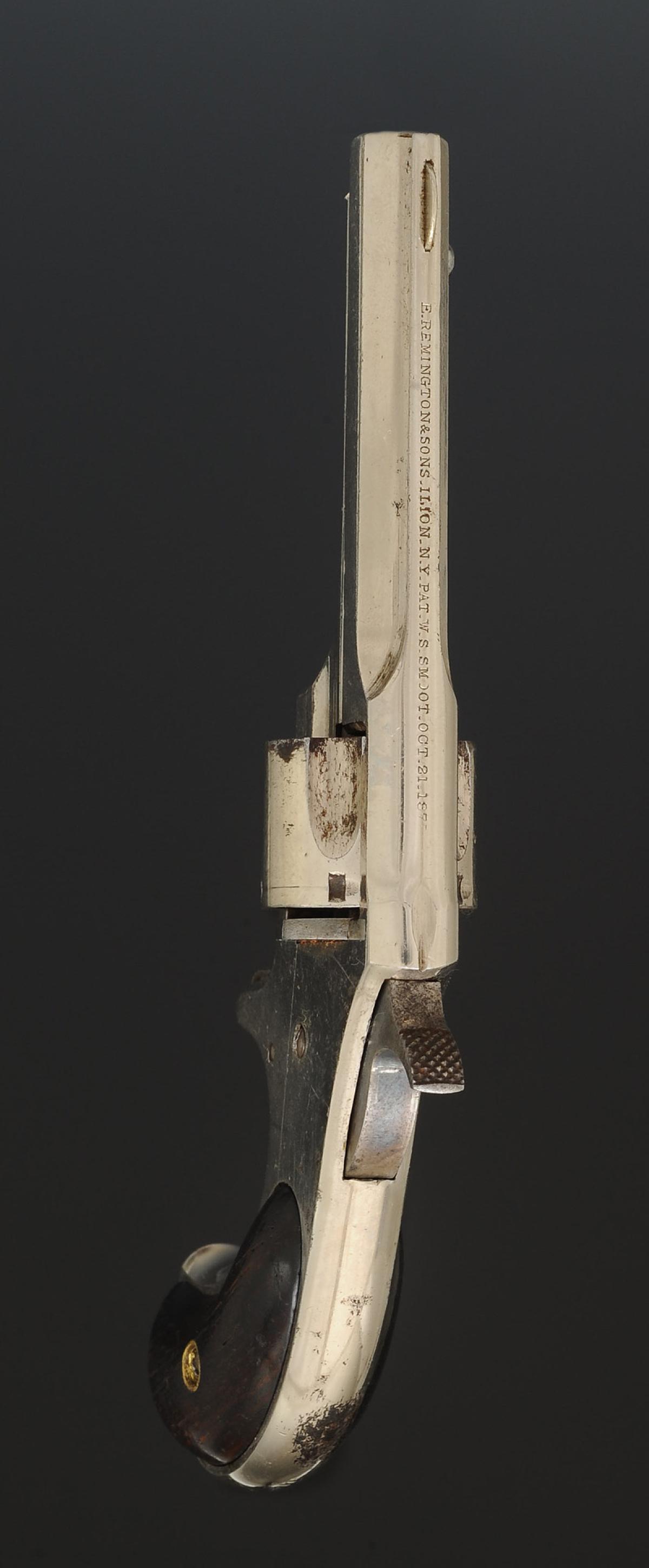 Fully nickel-plated, caliber .30, five-shot rimfire, 7 cm barrel, engraved on the top strap "E. REMINGTON & SONS. II. ION. N.Y. PAT. N. S. SNOOT. OCT. 21. 1877". Five-shot cylinder. Walnut grip panels. One grip panel numbered "1932" on its inner face.