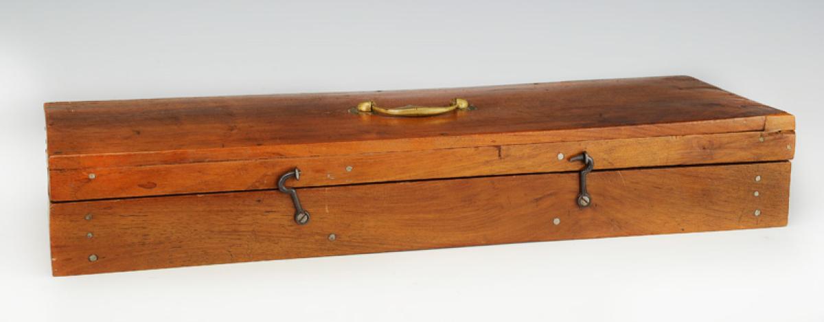 Wooden case not original to the model. Length 53 cm, width 19 cm, H 8.3 cm. Brass handle, interior re-lined with blue cloth at a later date.