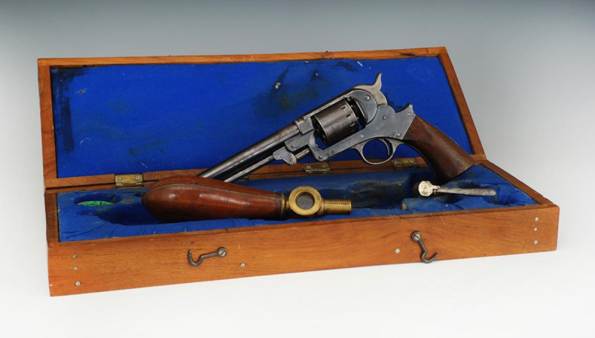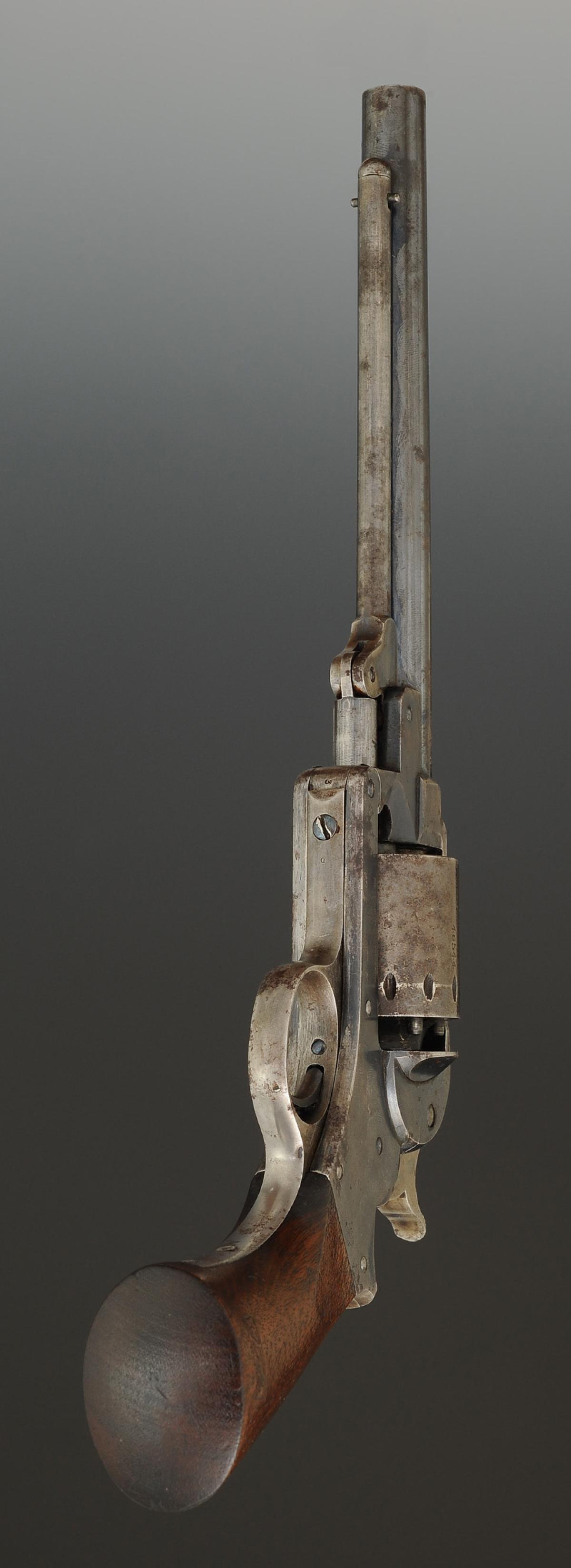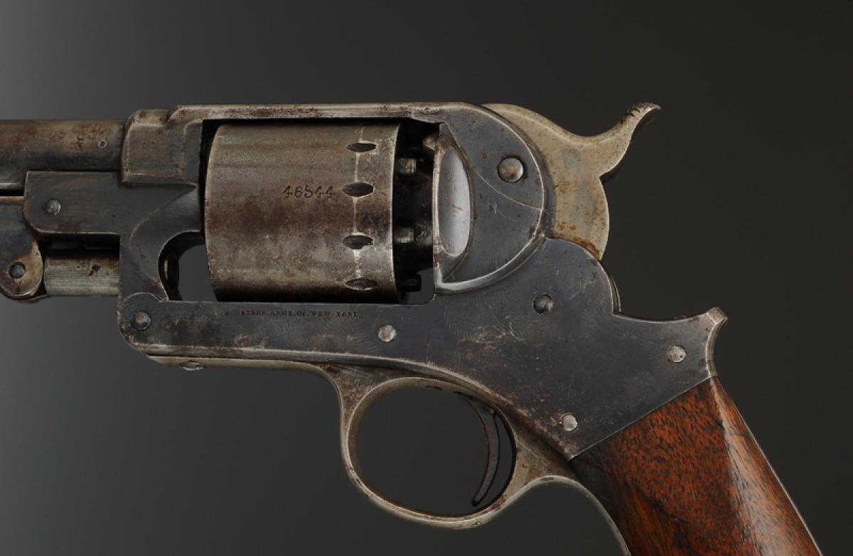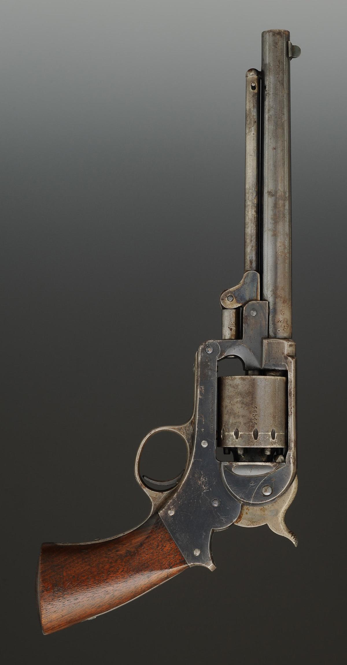 Fully bronzed. Round barrel, length 18 cm, with sight. Frame marked "STARR.ARMS.Co NEW YORK." on one side, and on the other side "STARR'S PATENT JAN.15.1856." Single action. Six-shot central percussion cylinder, serial number "46544." Walnut grip with inspector George W. Chapman's control stamp "G W C."
