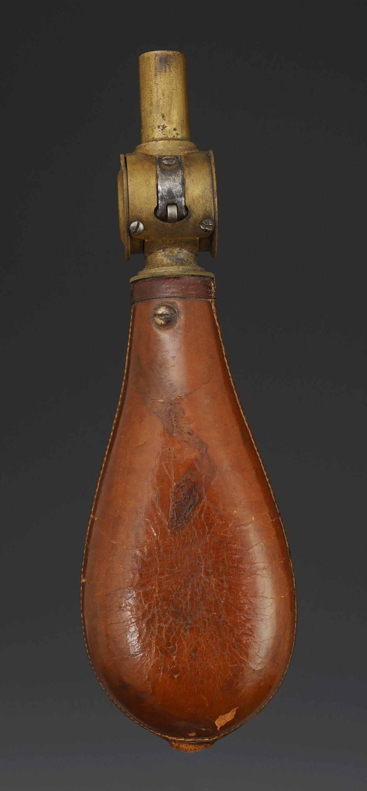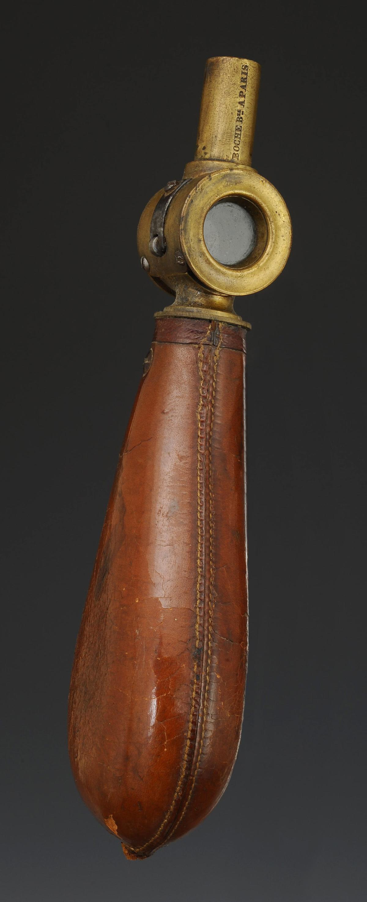 Brown leather powder flask with brass spout marked "BOCHE BTE A PARIS."