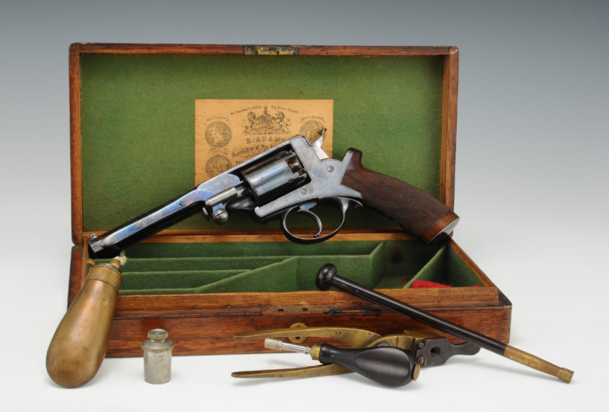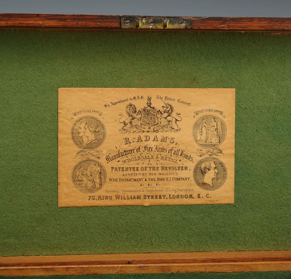 Presented in a walnut case, length 34.5 cm x 17 cm, H 6.5 cm. Clad in green felt, interior of the lid with a printed paper label with the manufacturer's name "R. ADAMS. Manufactured of Fire Arms of All Kinds ... 76. KING WILLIAM STREET. LONDON. E.C.". Brass lock with its key.