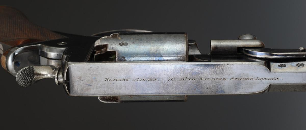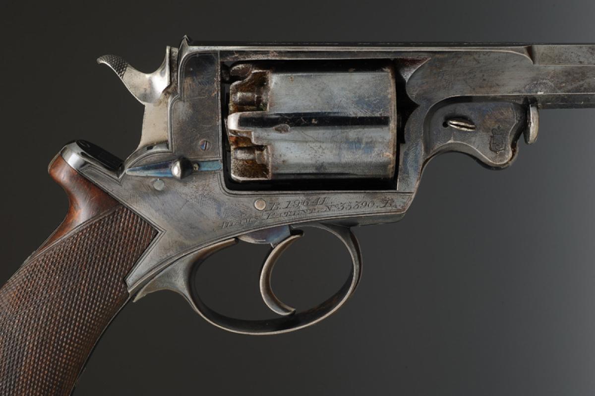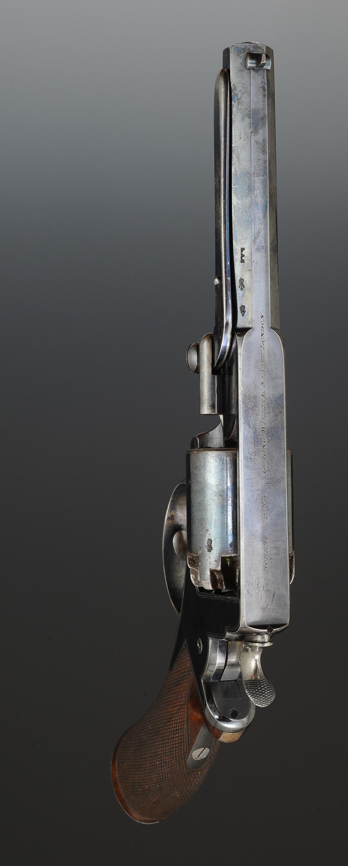 Fully bronzed revolver. Octagonal barrel, length 10 cm, marked on the top side of the barrel "ROBERT ADAMS. 76. KING WILLIAM STREET LONDON", with sight. Engraved frame "B. 19,641. / ADAMS'S PATENT. N° 35390.R.", stamped by the London Armory Company: coat of arms with the initials "LAC" surmounted by a royal crown. Finely checkered walnut grip. Double action. Five-shot cylinder. Loading lever positioned on the left side.