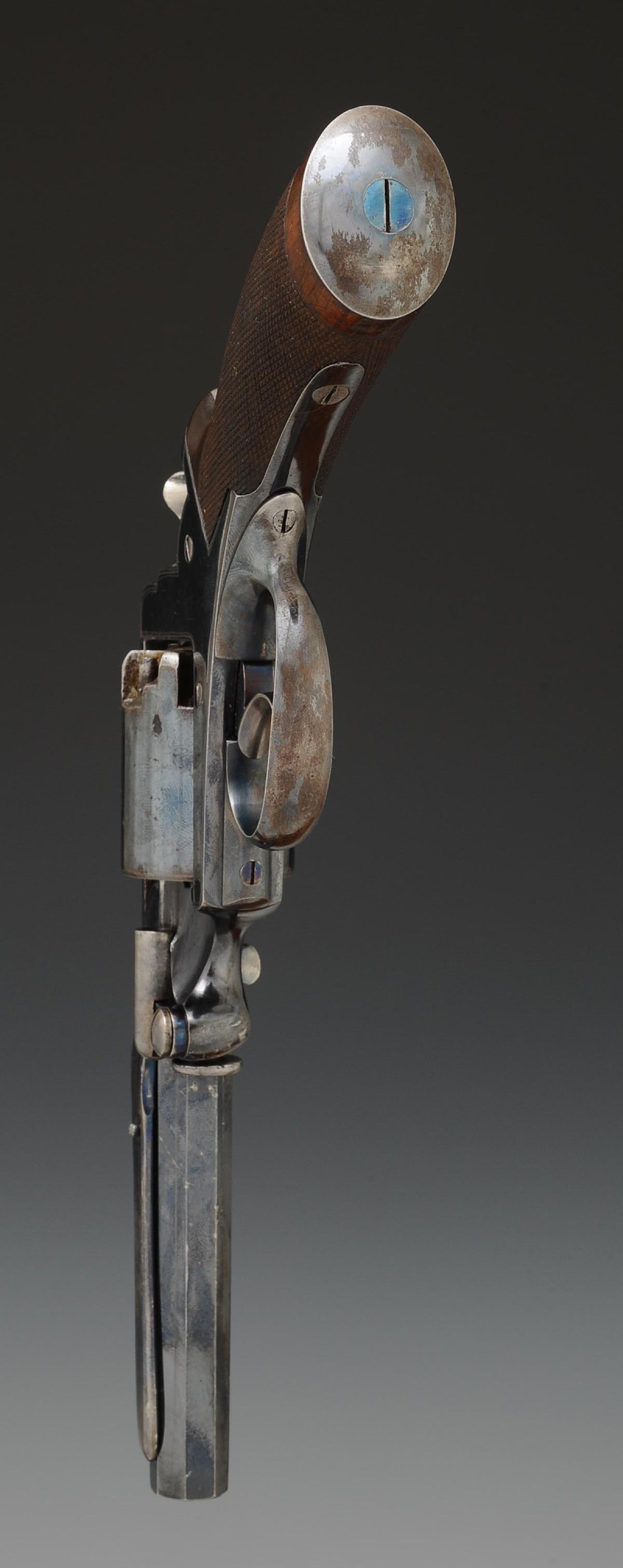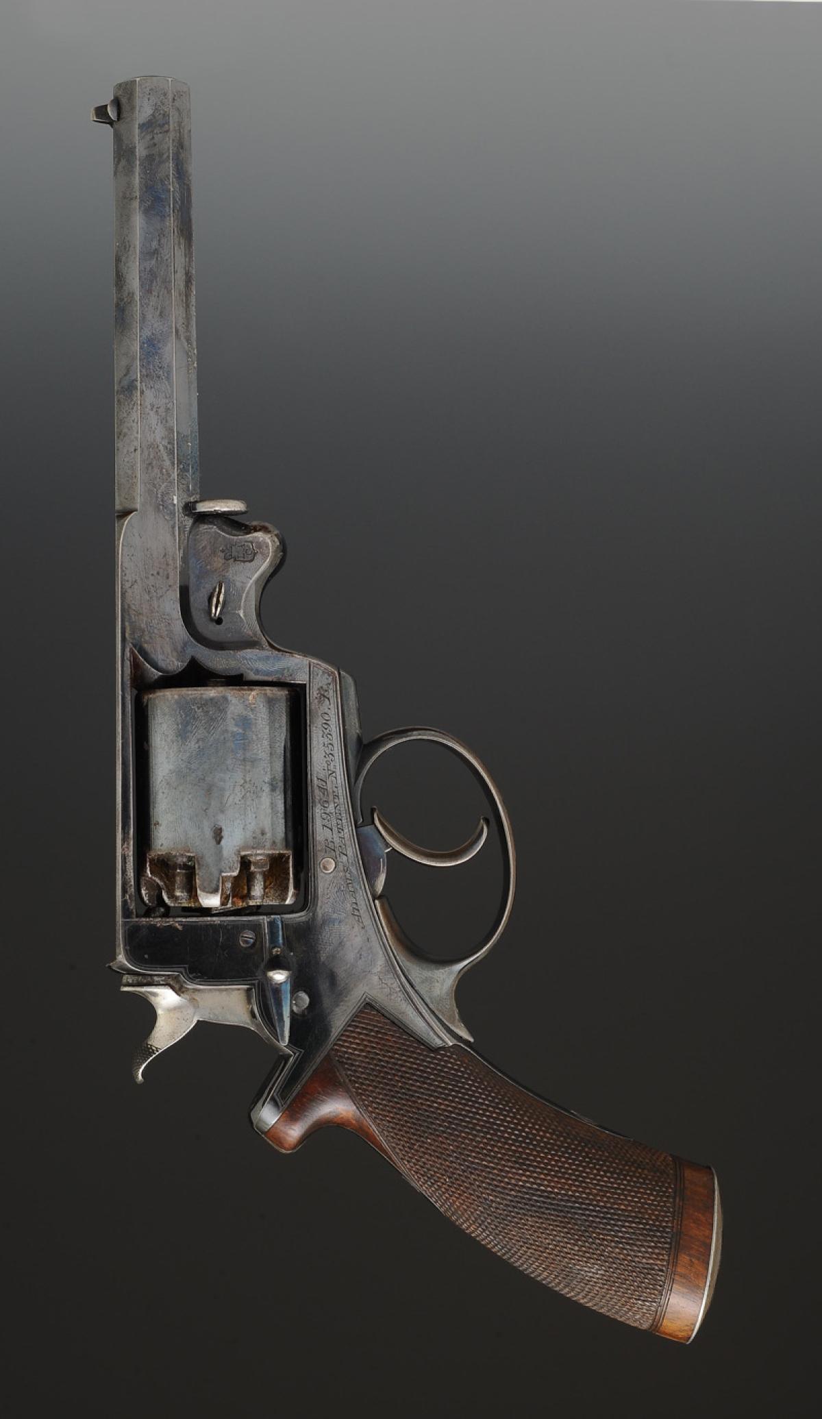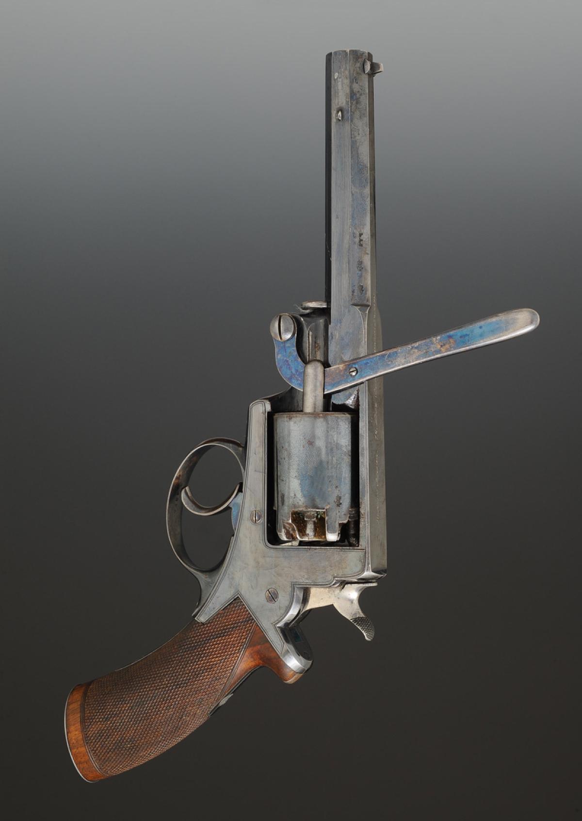 Fully bronzed revolver. Octagonal barrel, length 10 cm, marked on the top side of the barrel "ROBERT ADAMS. 76. KING WILLIAM STREET LONDON", with sight. Engraved frame "B. 19,641. / ADAMS'S PATENT. N° 35390.R.", stamped by the London Armory Company: coat of arms with the initials "LAC" surmounted by a royal crown. Finely checkered walnut grip. Double action. Five-shot cylinder. Loading lever positioned on the left side.