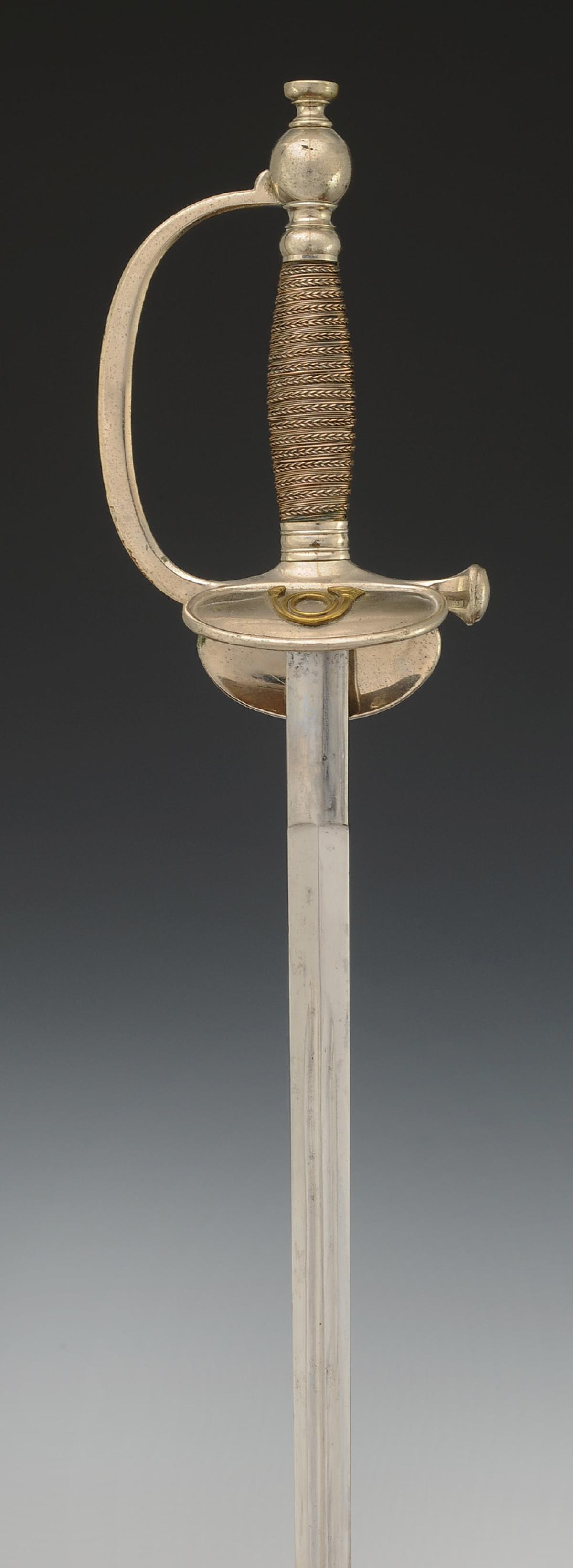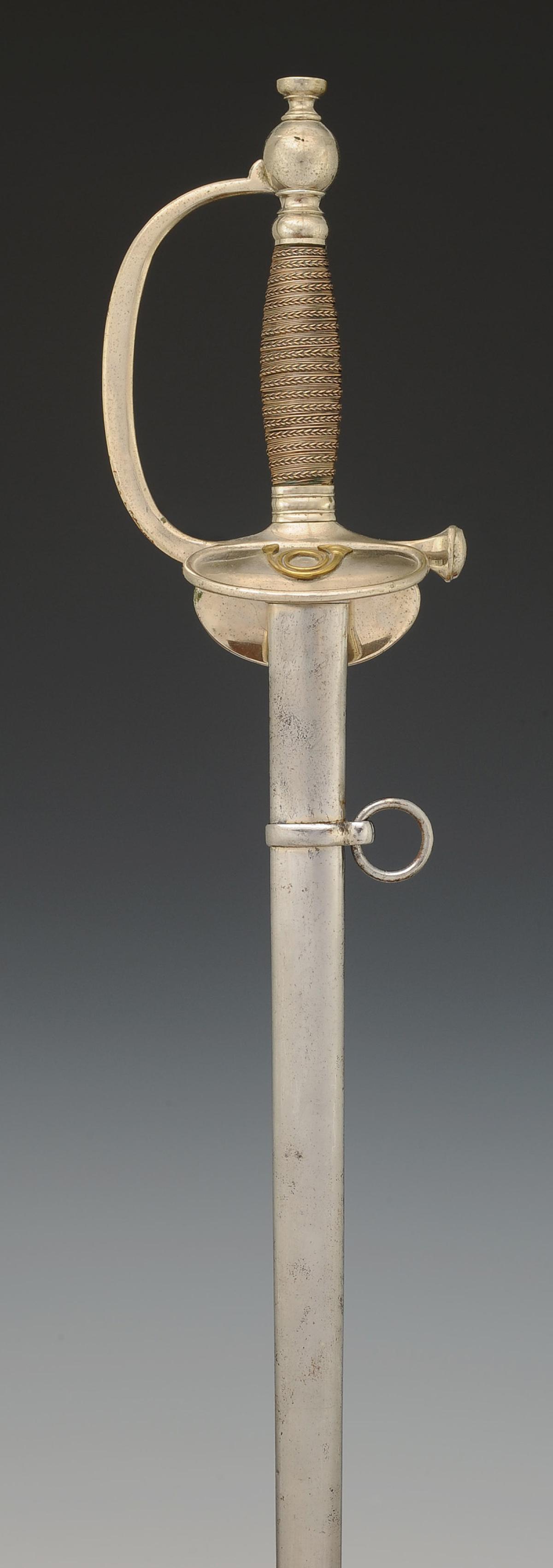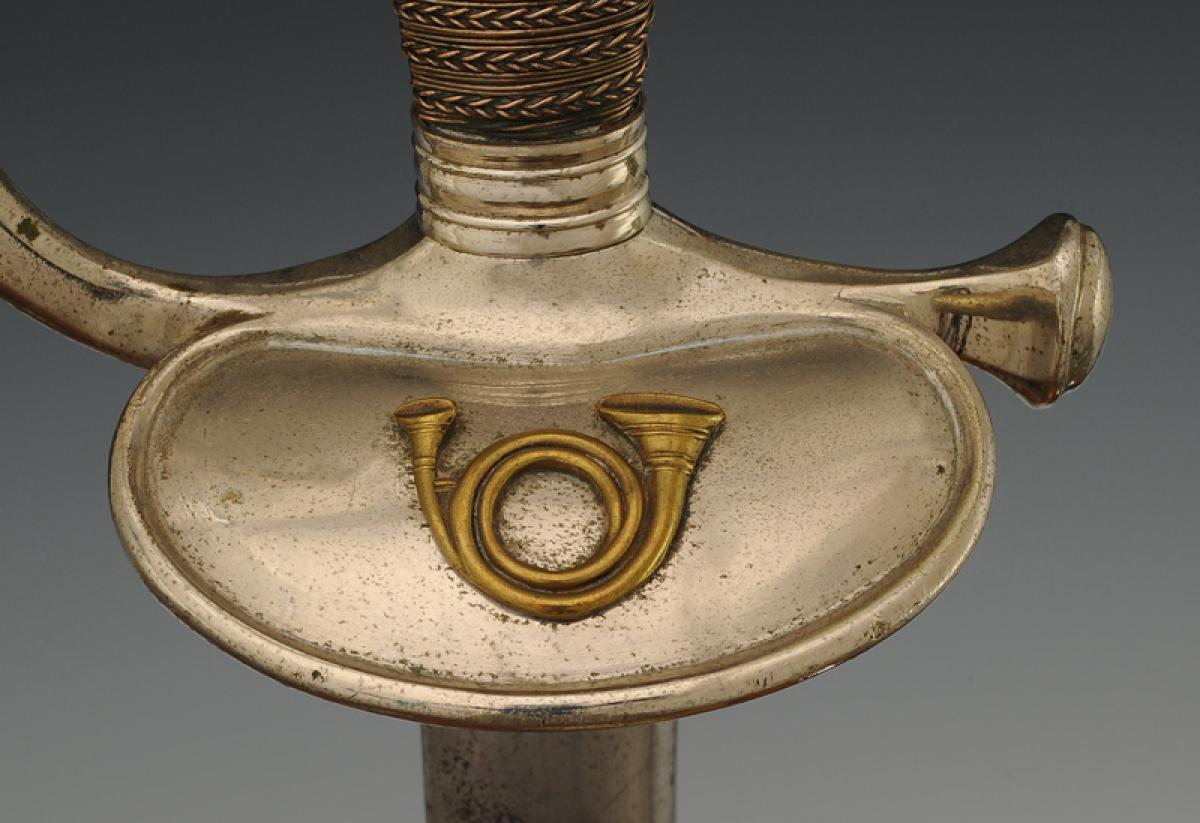 Nickel-plated steel hilt. Smooth branch guard. Bivalve hilt decorated with an added and riveted brass hunting horn. Folding counter-guard. Round pommel, ferrules decorated with lines. Wood handle entirely filigreed with silver-plated copper. Natural buffalo tie. Nickeled blade with gutters and central ridge, length 86.8 cm. Nickel-plated steel scabbard with a suspension bar, blade tip cut in the shape of a lyre.