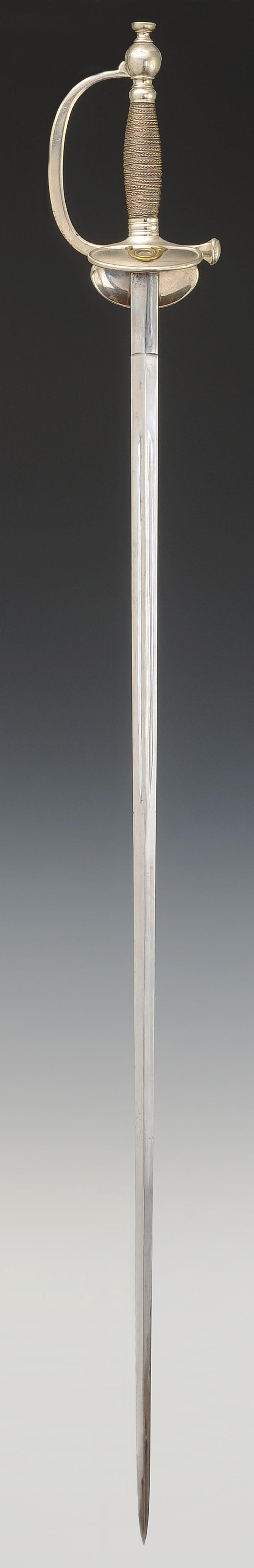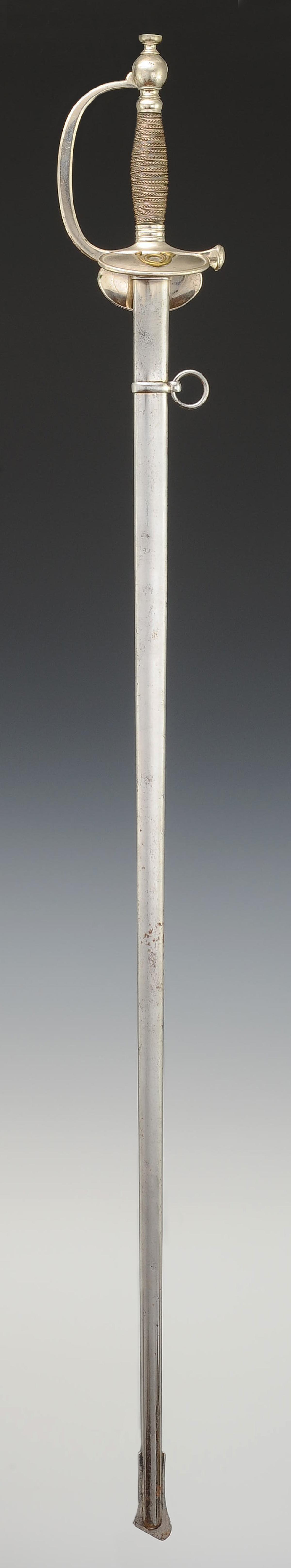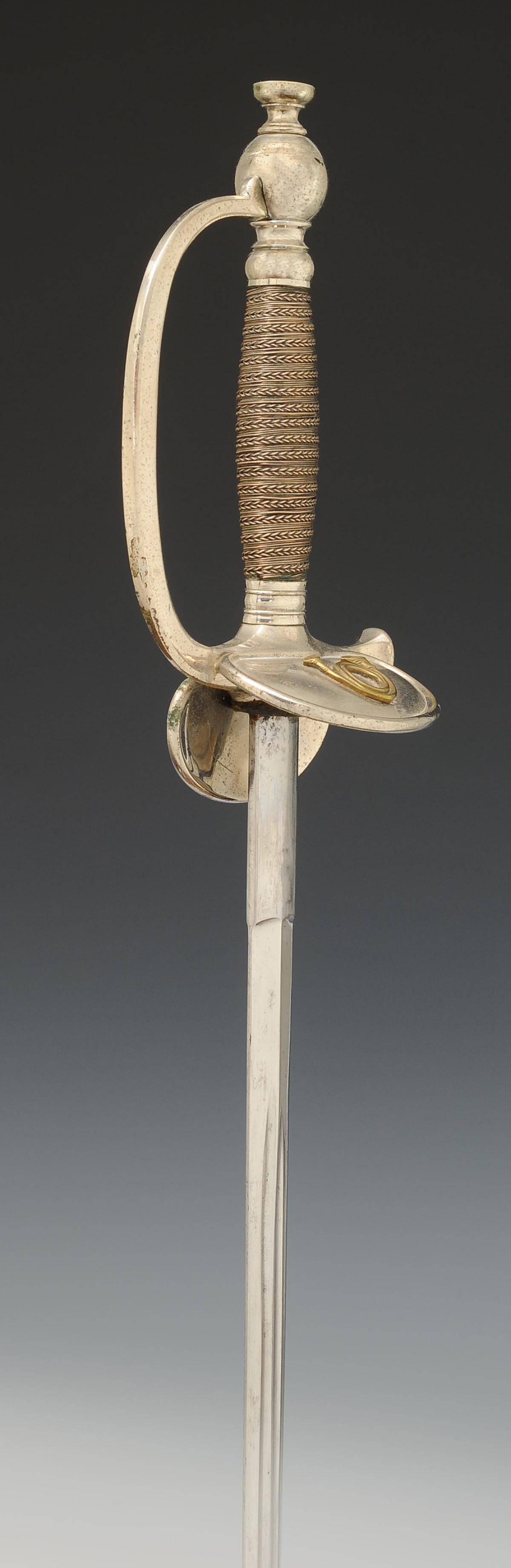 Nickel-plated steel hilt. Smooth branch guard. Bivalve hilt decorated with an added and riveted brass hunting horn. Folding counter-guard. Round pommel, ferrules decorated with lines. Wood handle entirely filigreed with silver-plated copper. Natural buffalo tie. Nickeled blade with gutters and central ridge, length 86.8 cm. Nickel-plated steel scabbard with a suspension bar, blade tip cut in the shape of a lyre.