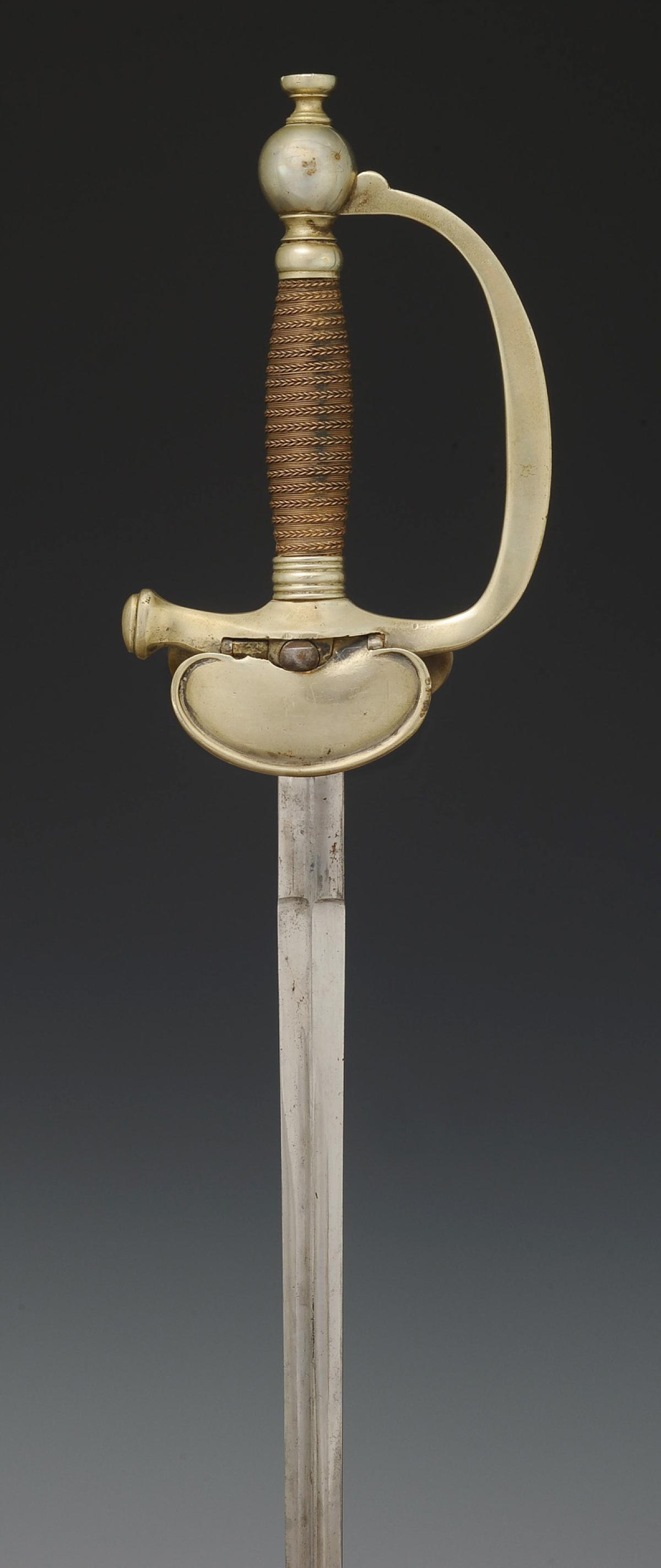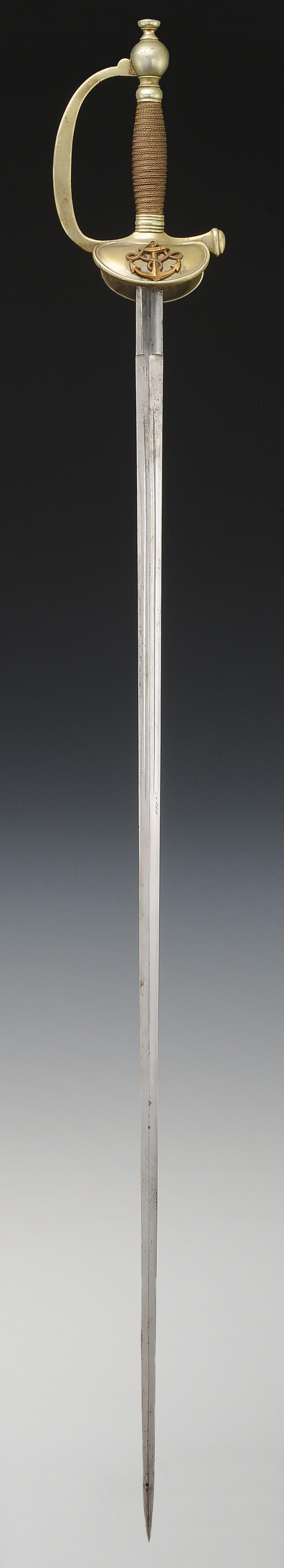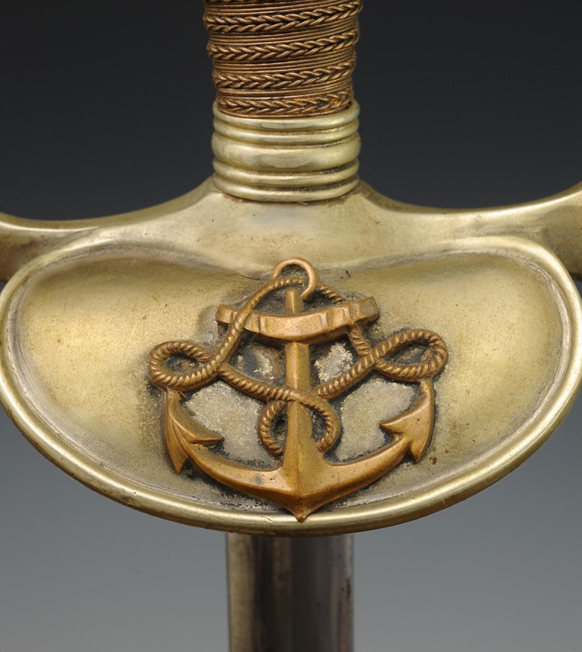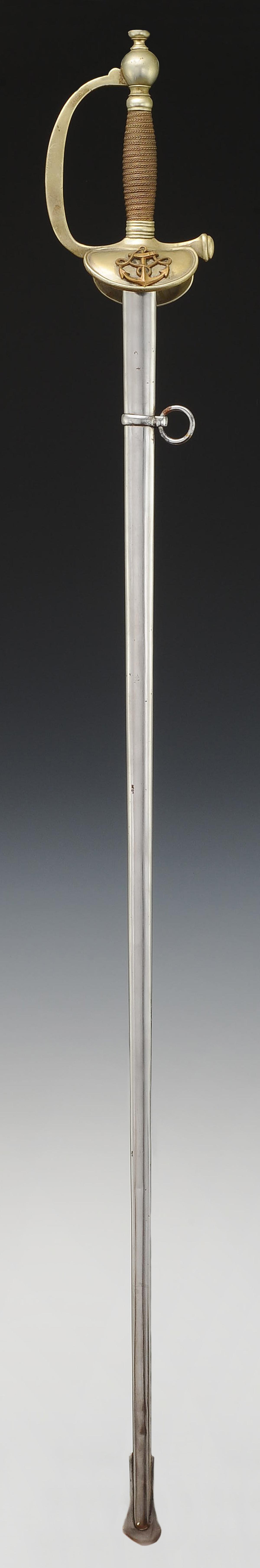 Mounting in maillechort. Smooth branch guard. Bivalve keyboard decorated with a copper anchor applied and riveted. Folding counter-keyboard. Rounded pommel, ferrules decorated with lines. Handle in wood entirely filigreed with silvered copper. Natural buffalo tie. Nickel-plated blade with gutters and central ridge, length 87 cm. Polished steel scabbard with a suspension ring bracket, blade tip shaped like a lyre.