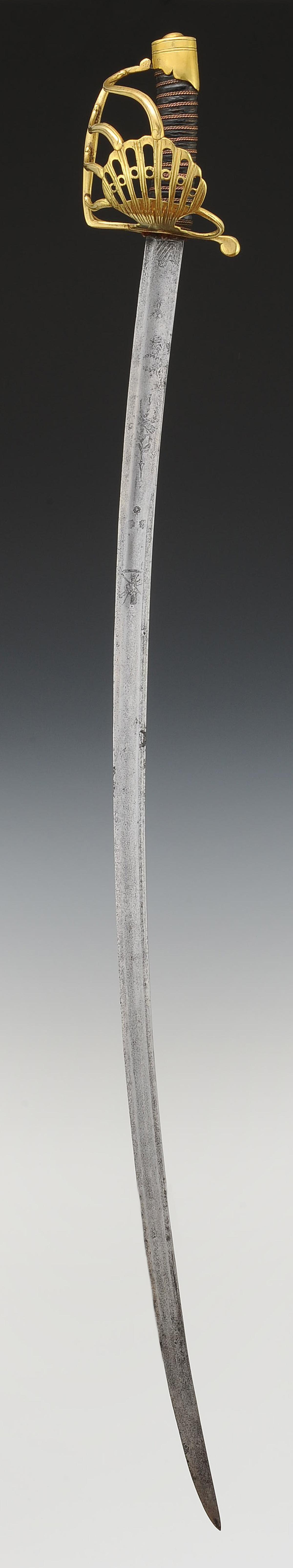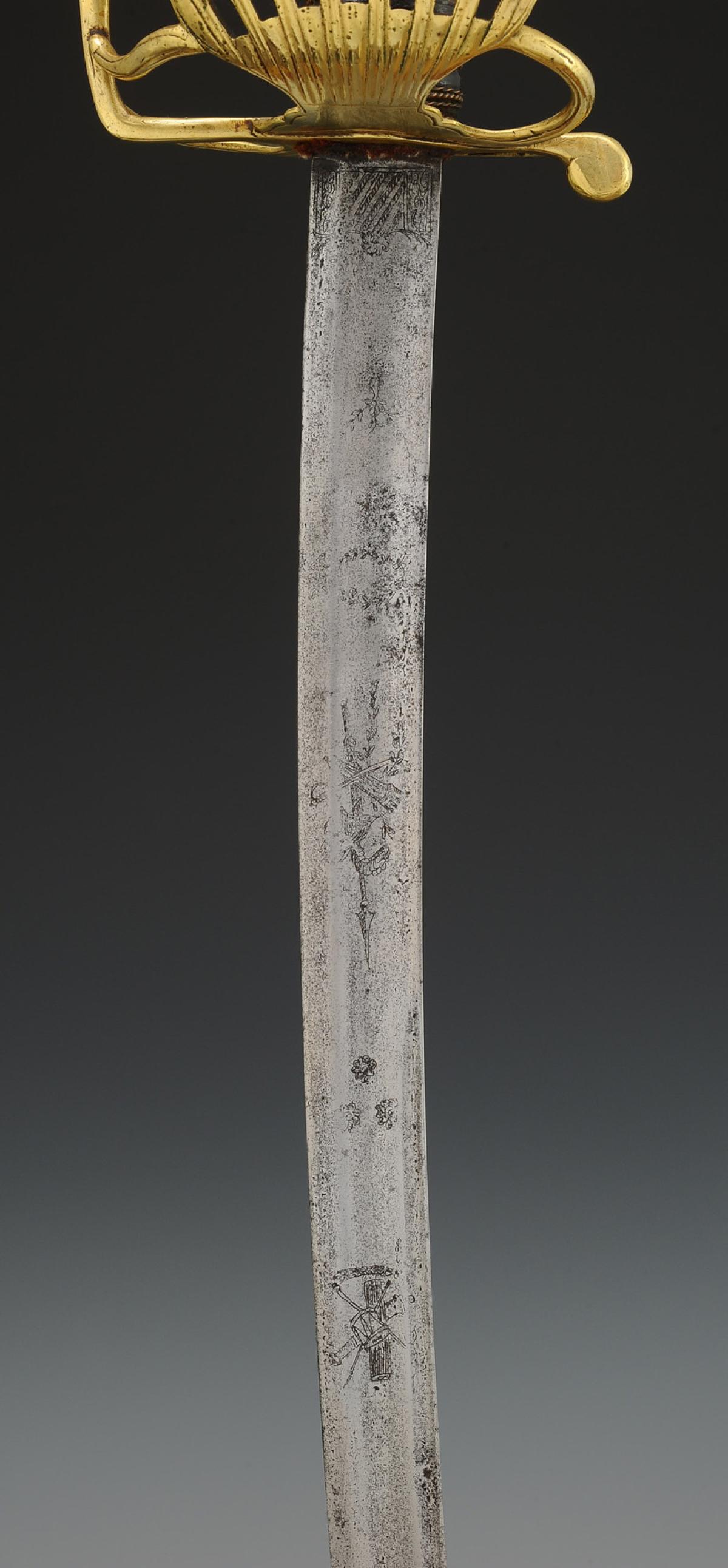 Brass hilt. Guard with six branches forming at the front an openwork palmette-shaped shell, known as the "battle guard." Octagonal pommel with a short tail decorated with lines. Wooden handle wrapped in black waxed calfskin, with copper wire filigree. Scarlet cloth tie. Curved blade with hollow edges, length 94 cm, engraved on its first third with military trophies and floral decorations, and three fleurs-de-lis masked by flowers. Black varnished leather scabbard with three brass fittings decorated with lines and scalloped edges, brass tip.