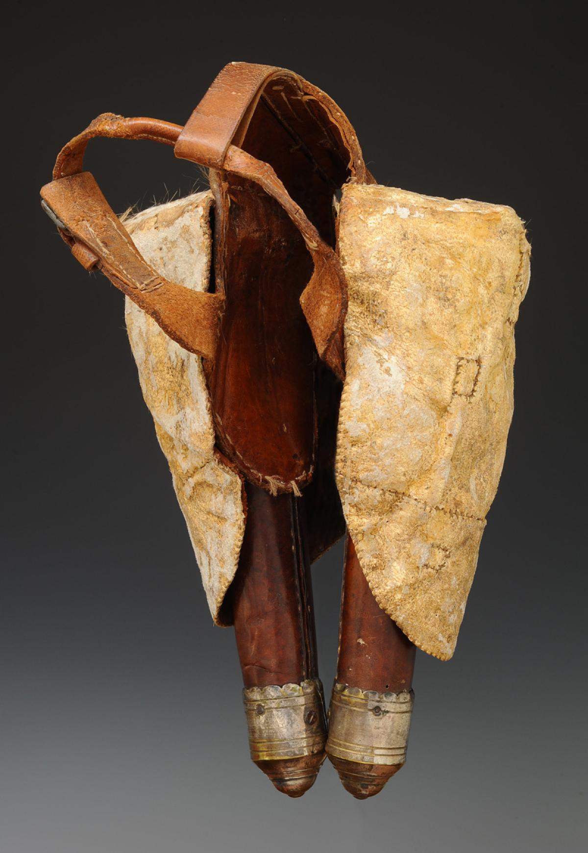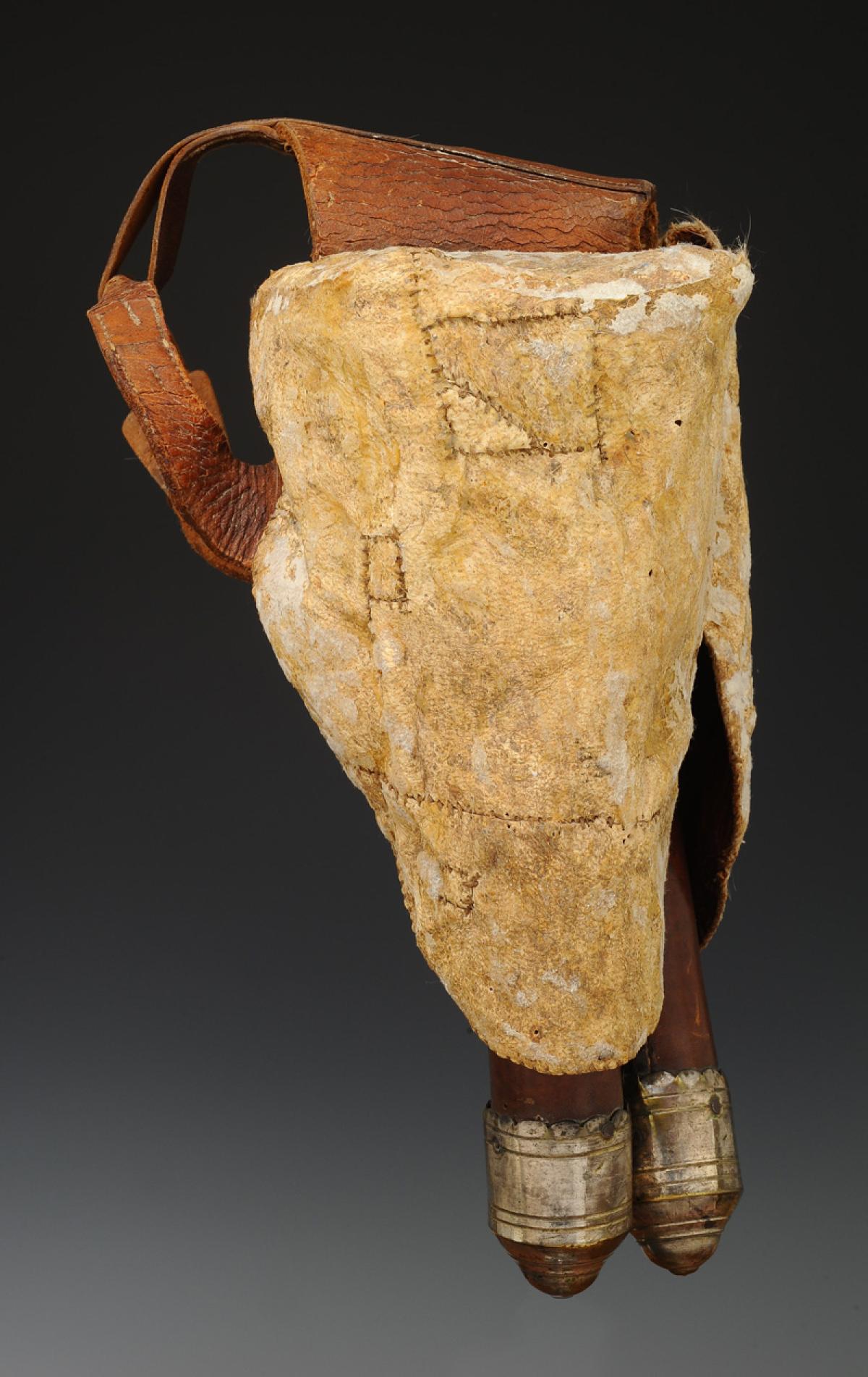 Made of brown waxed leather with silver-plated brass tips, H 6 cm, total H 32.5 cm, internal dimensions in the upper part width 10 cm and depth 6.5 cm, connected together by a strong brown waxed cowhide strap. Holster covers made of calf leather.