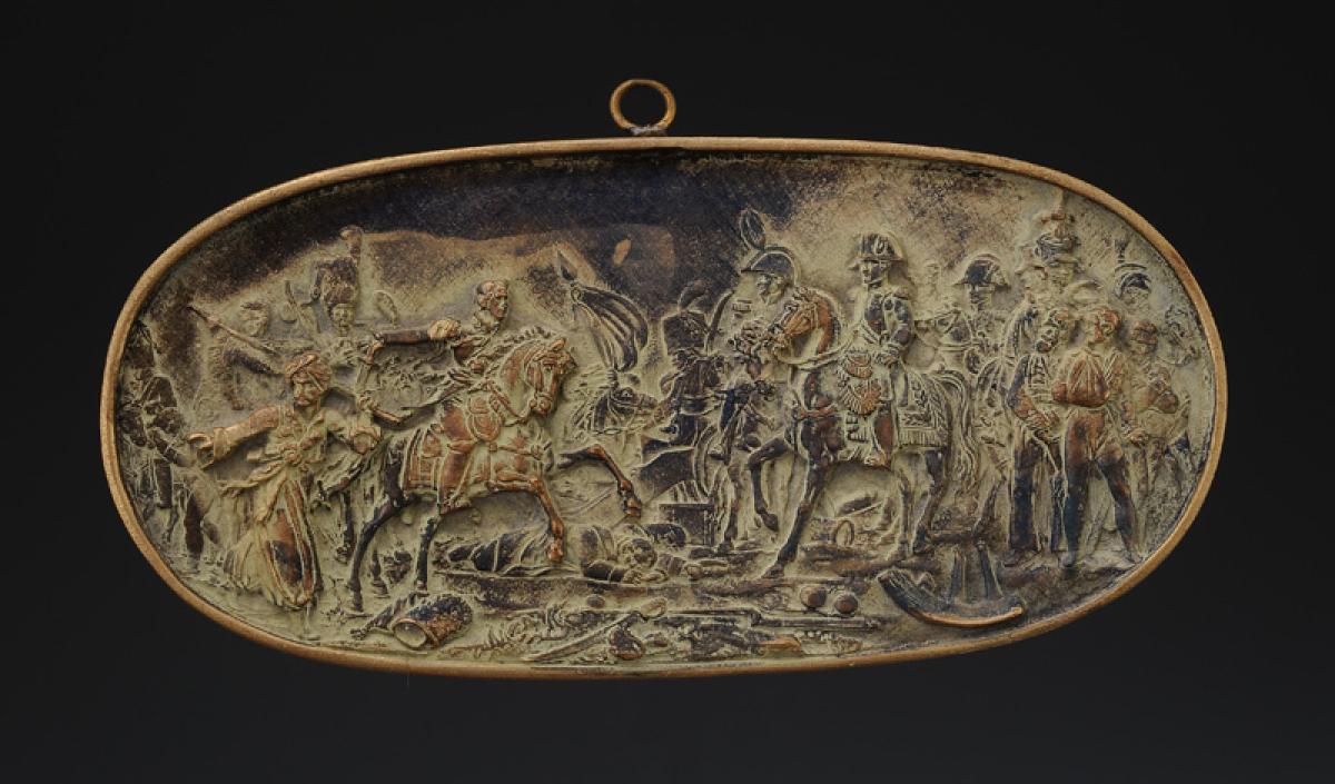 Oval-shaped plaque, H 10 cm x 20.5 cm wide. It depicts in relief the Battle of Austerlitz.