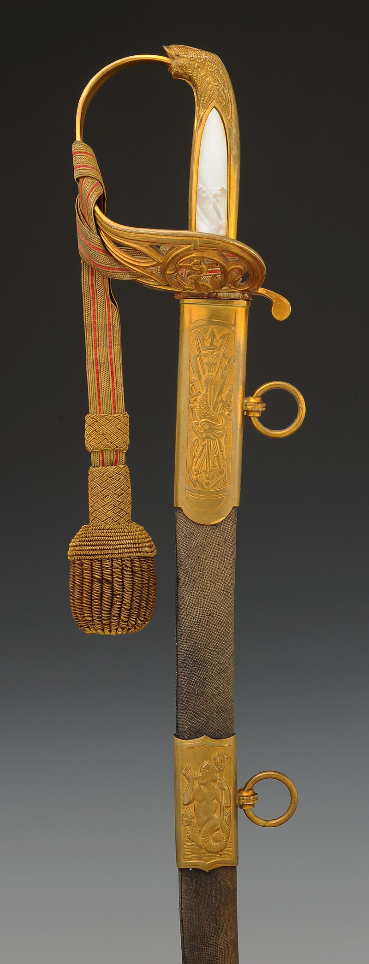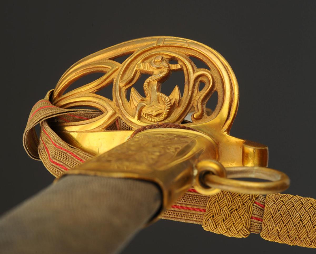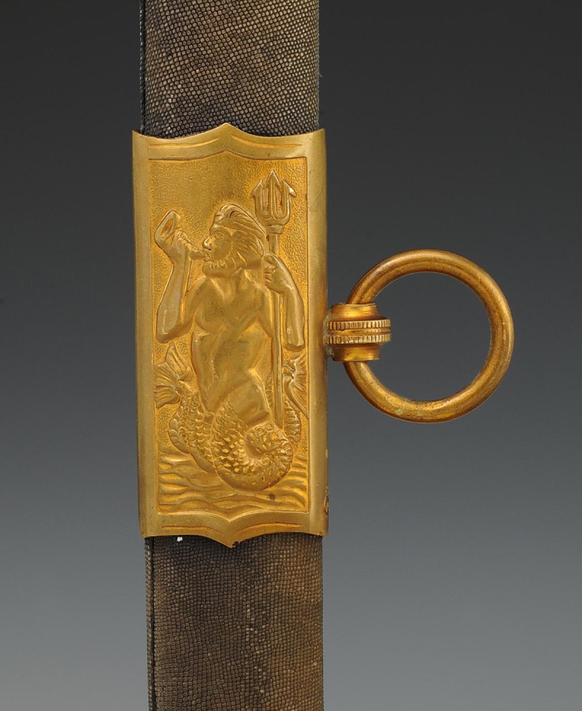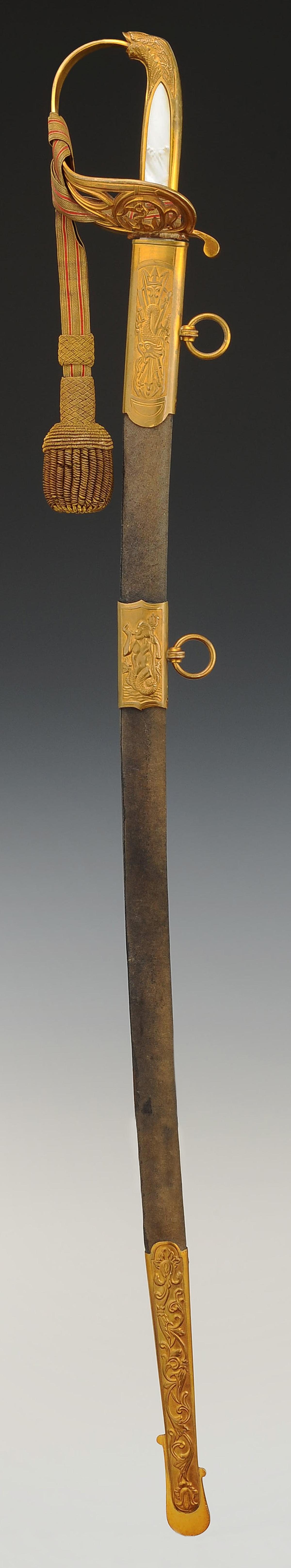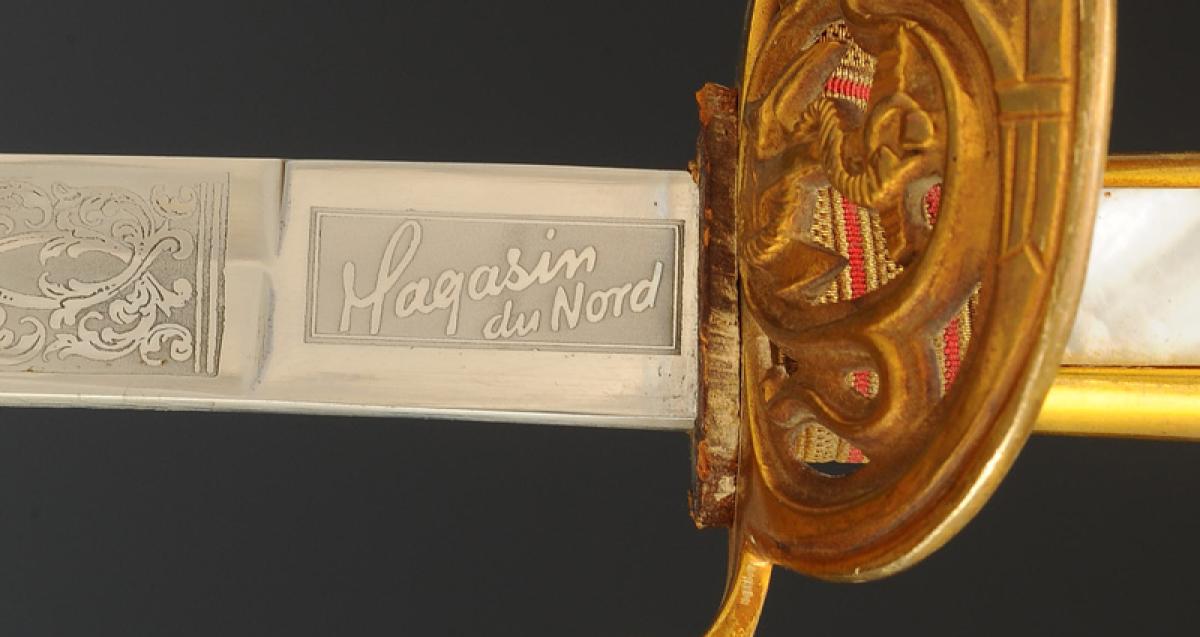Gilt bronze hilt. Two-branched guard forming an openwork shell decorated with an oval medallion depicting a marine anchor and scrollwork. Pommel forming a handle decorated with foliage. Handle hollowed out in the center on each side and decorated with mother-of-pearl plates. Ferrule adorned with lines. Slightly curved blade with grooves and hollow facets, length 79 cm, nickel-plated and acid-etched: on one side a crowned marine anchor and a rich vegetal décor, signed at the heel "Magasin du Nord", and on the other side a rich vegetal décor, signed at the heel with the logo of the German firm HÖRSTER in Solingen. Natural buffalo leather sword knot. Wooden scabbard covered with dark grey sharkskin with three gilt brass fittings decorated in relief: the chape depicting a trophy of naval weapons with a loop and ring for suspension, the central fitting representing Neptune the god of the sea, and the end of the scabbard adorned with foliate scrolls ending in a lyre-shaped cut-out dart. Gold bullion sword knot, flat cord with two scarlet stripes, tassel with thick twisted threads known as "spinach seeds".
