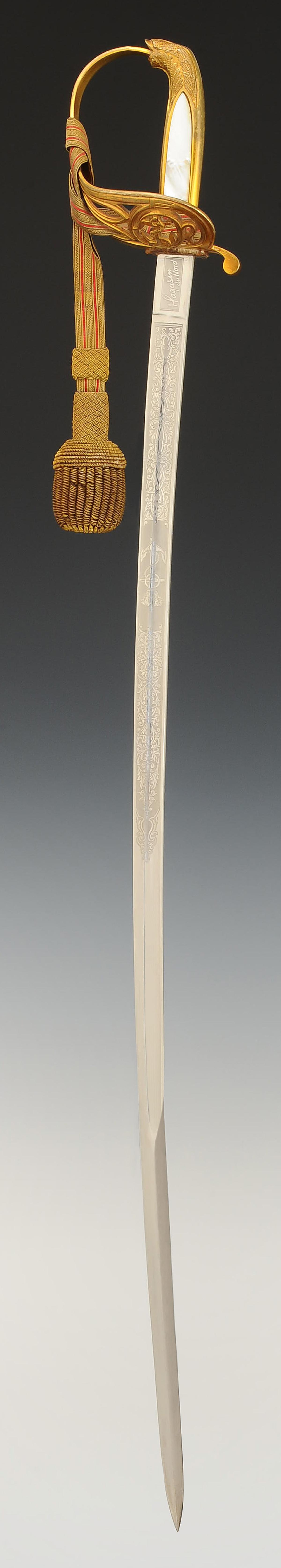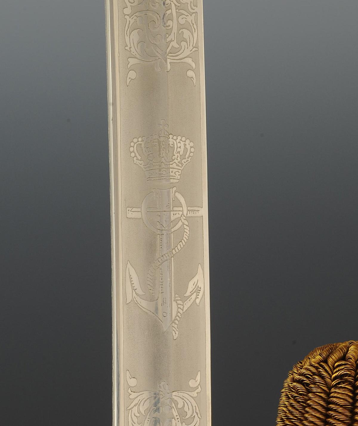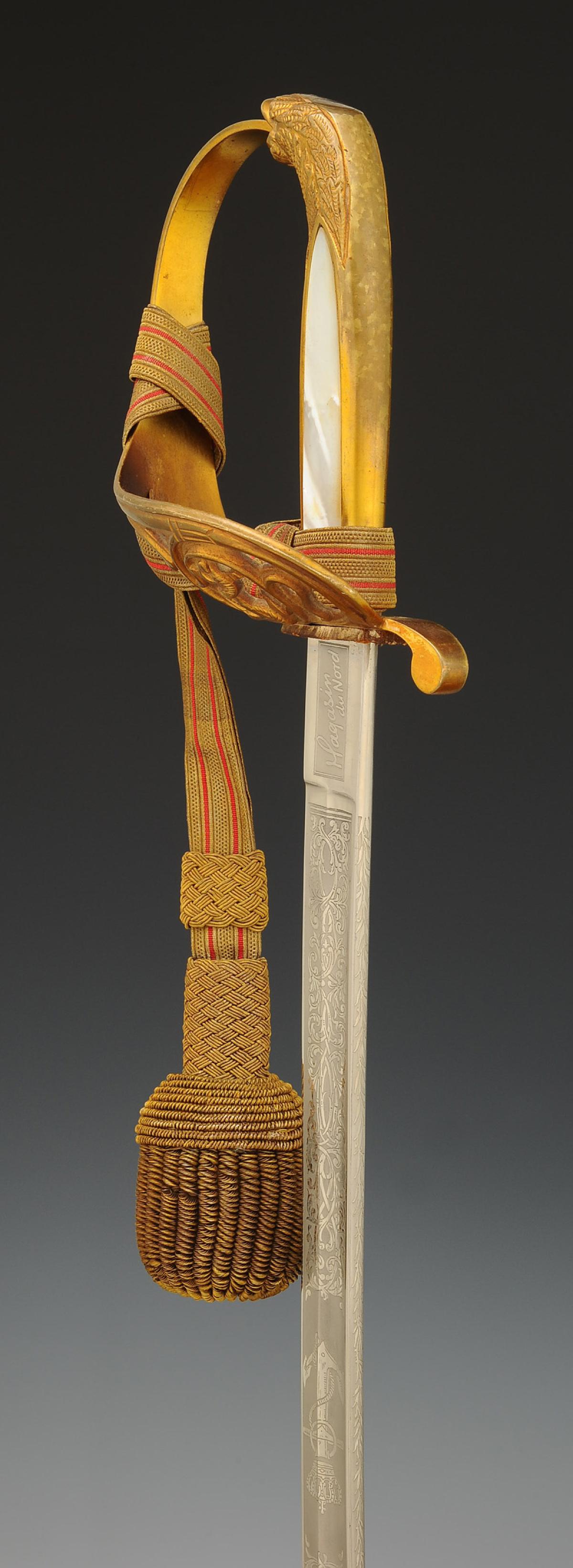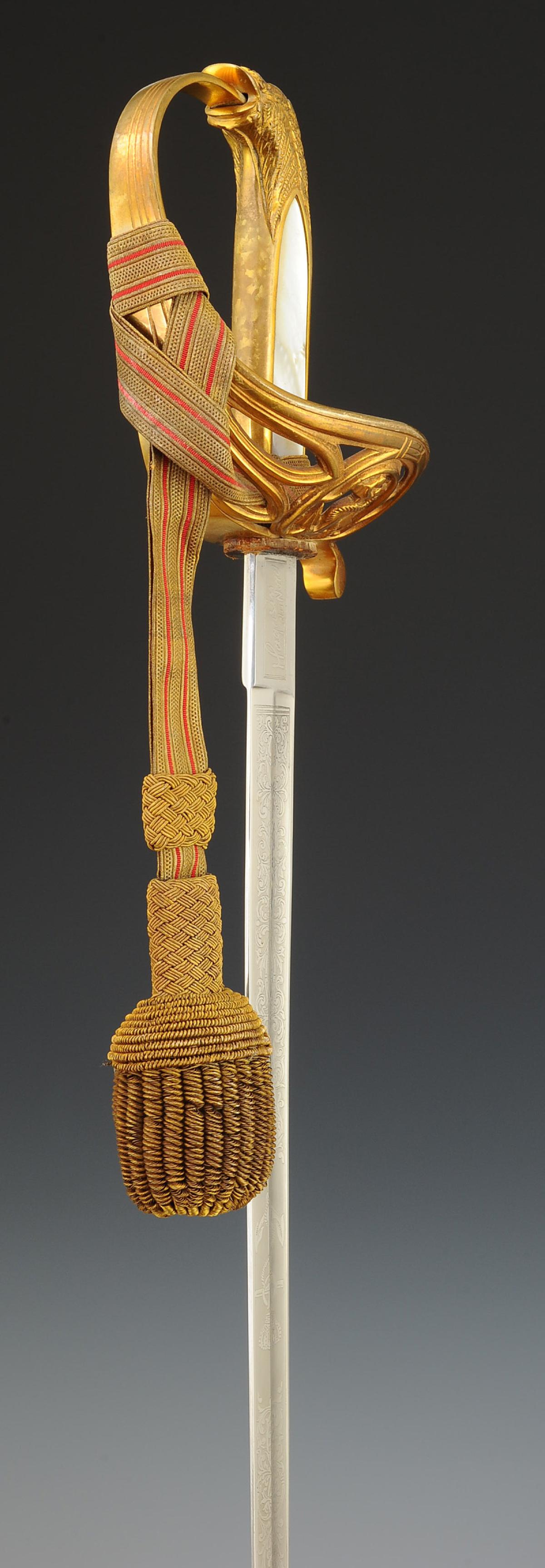 Gilt bronze hilt. Two-branched guard forming an openwork shell decorated with an oval medallion depicting a marine anchor and scrollwork. Pommel forming a handle decorated with foliage. Handle hollowed out in the center on each side and decorated with mother-of-pearl plates. Ferrule adorned with lines. Slightly curved blade with grooves and hollow facets, length 79 cm, nickel-plated and acid-etched: on one side a crowned marine anchor and a rich vegetal décor, signed at the heel "Magasin du Nord", and on the other side a rich vegetal décor, signed at the heel with the logo of the German firm HÖRSTER in Solingen. Natural buffalo leather sword knot. Wooden scabbard covered with dark grey sharkskin with three gilt brass fittings decorated in relief: the chape depicting a trophy of naval weapons with a loop and ring for suspension, the central fitting representing Neptune the god of the sea, and the end of the scabbard adorned with foliate scrolls ending in a lyre-shaped cut-out dart. Gold bullion sword knot, flat cord with two scarlet stripes, tassel with thick twisted threads known as "spinach seeds".