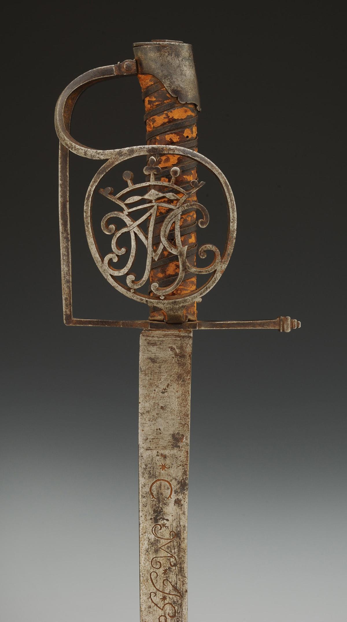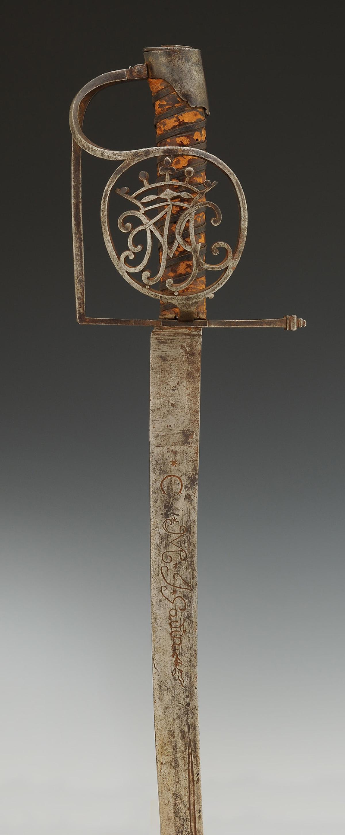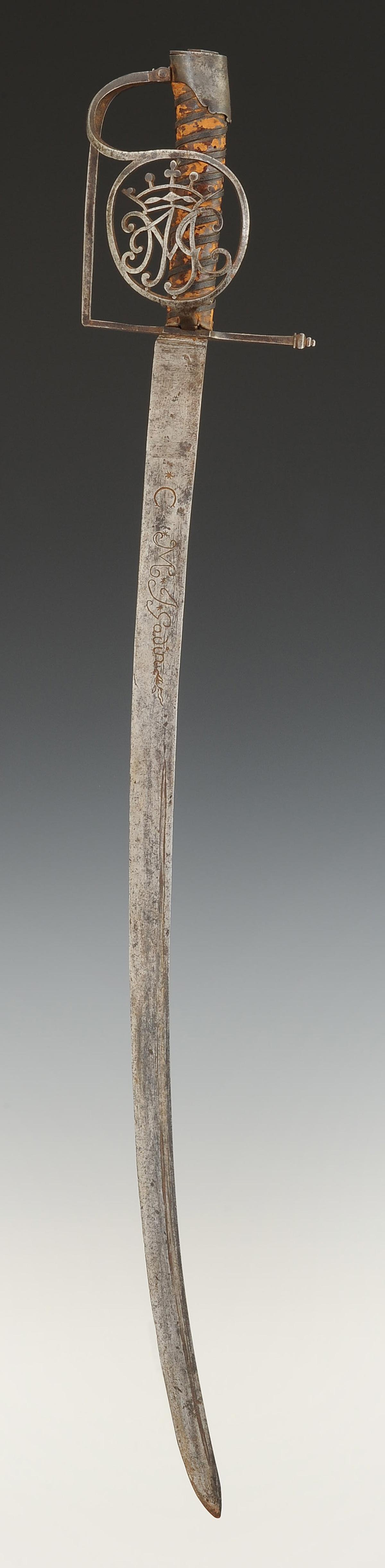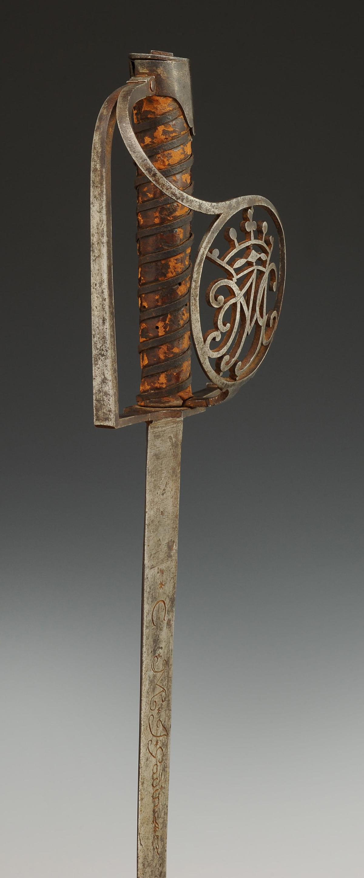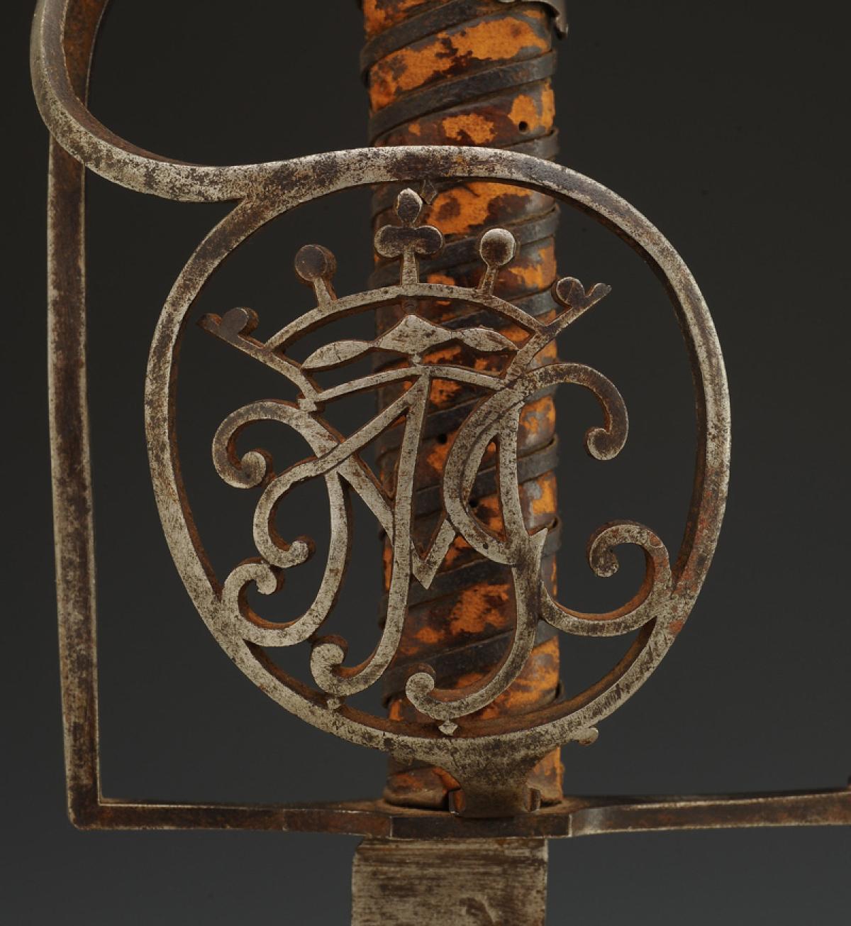 Iron hilt. Guard with two branches forming a shell in the shape of a medallion cut with the monogram "JMG" topped with a marquis crown.