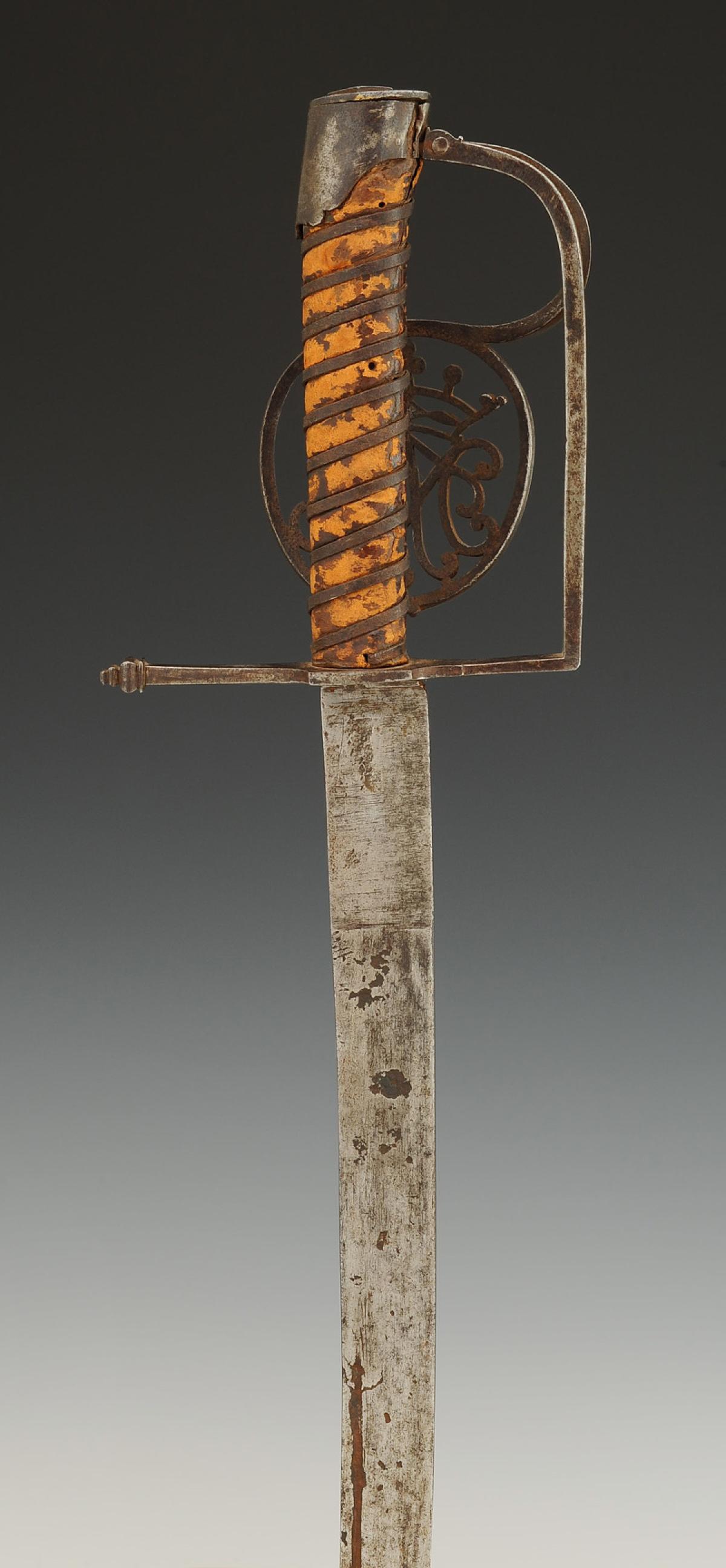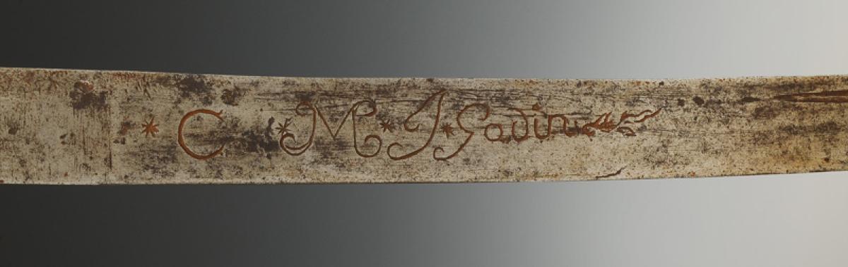 Wooden handle wrapped in leather with a wide iron filigree. Pommel with a short tail and scalloped edge. Hollow-ground straight blade, slightly curved, engraved on one side "C.M.J.GODIN", length 64.5 cm.