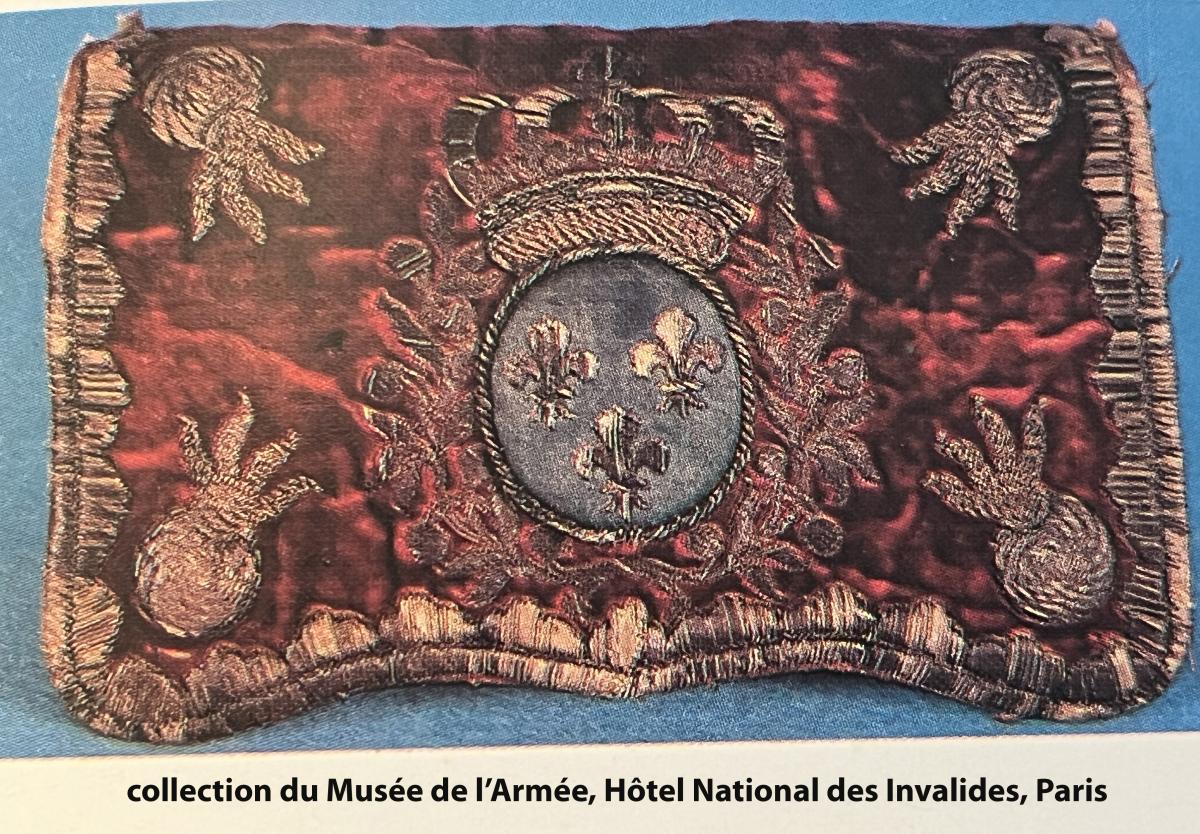 Giberne or "cartridge box worn on the belt" covered with a rectangular flap cut in a scalloped design at its lower part, width 172 mm, height 95 mm; garnet velvet background embroidered with silver, the four grenades placed in the corners are of the same metal and spun with yellow silk flames (approximately 24 mm width, 13 mm height), in the center are embroidered the Arms of France composed of an oval shield (38 mm width, 44 mm height) in azure velvet embroidered with three fleur-de-lis and framed by a passementerie cord, on each side a laurel branch is embroidered, and at the top the silver royal crown (47 mm width, approximately 37 mm height). The flap is bordered by a scalloped rod towards the inside (12 mm width). The edge and center of the shield are "padded" with cardboard to create a relief effect.