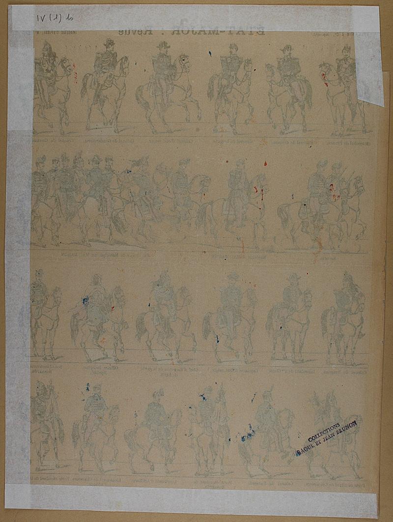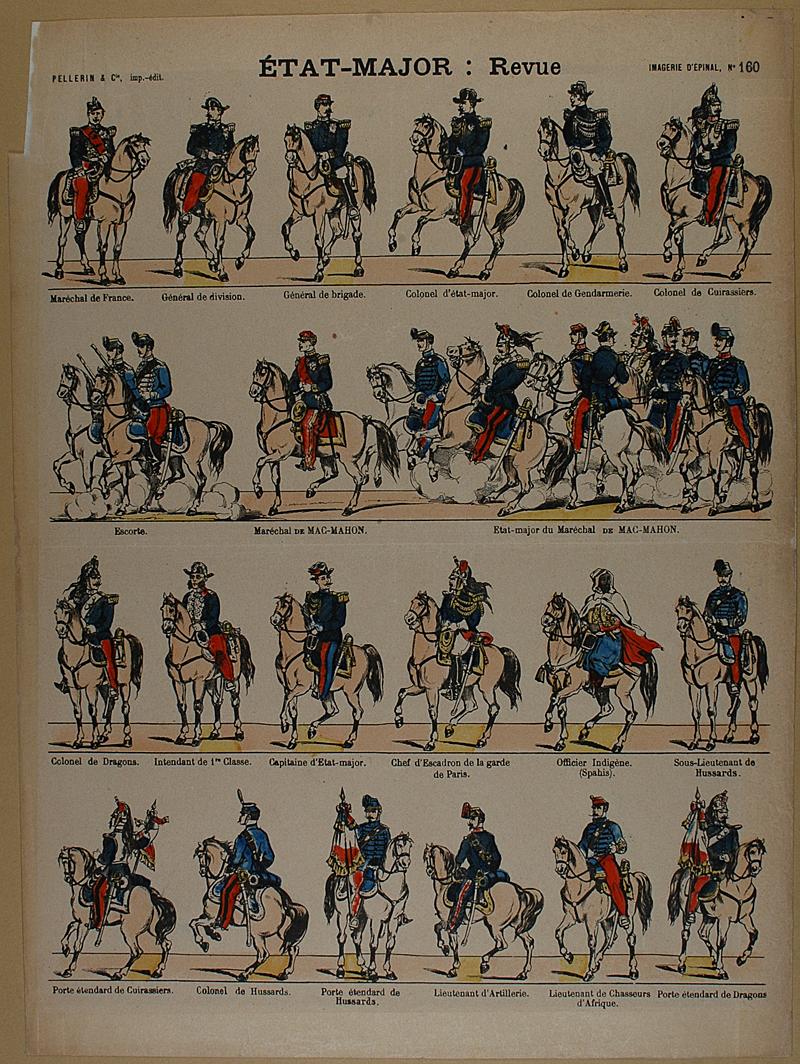 PELLERIN - " État-Major : Revue " - Imagerie d'Épinal - n° 160 - Planche en couleurs sur l' État-Major : Revue - Dimensions : 39,6 x 29,6 cm - En feuille édité par PELLERIN, imprimeur-éditeur (déposé) - Description : feuille avec un bord arraché, abîmé.
