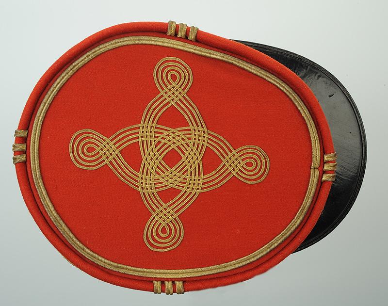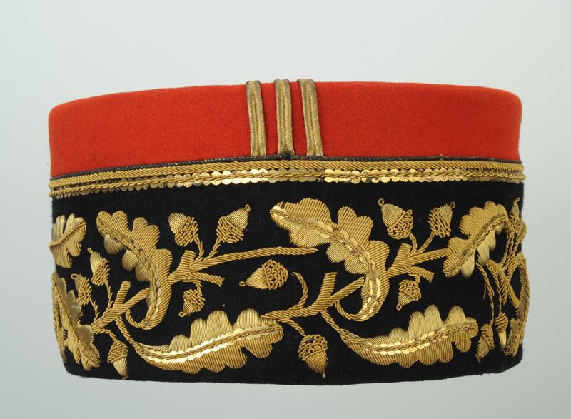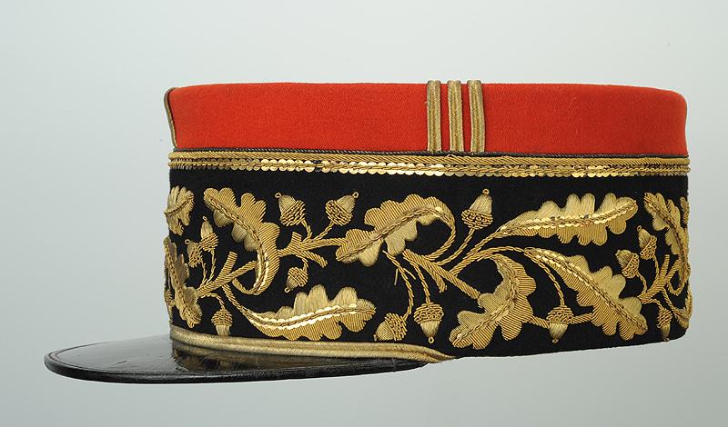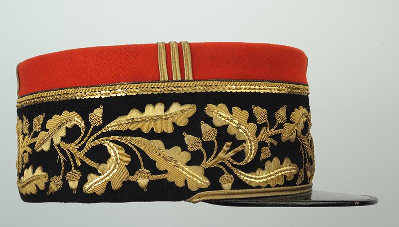 En drap garance, à soutache et galons d’or, bandeau en drap noir entièrement brodé d'une course de feuilles de chêne de 56mm de large et bordé dans sa partie supérieure de deux cordonnets de fils d’or un de 3,25 mm et l'autre de 1,5 mm de large et d’une baguette en paillettes et filets cannetilles d’or, dans sa partie basse, au niveau de la visière, tresse dor.