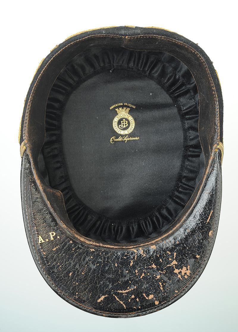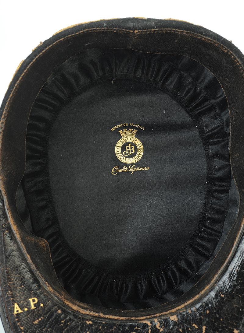 Visière en cuir ciré et verni noir, doublée de maroquin gaufré noir avec initiale en lettres d'or du militaire "A.P", et garnie d’un jonc en veau laqué noir plié à cheval sur la bordure extérieure.
