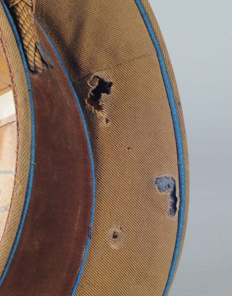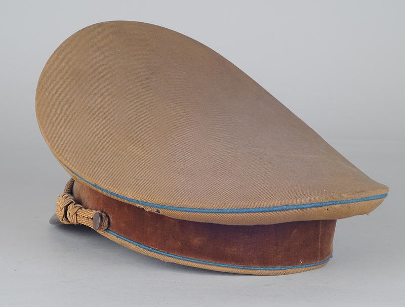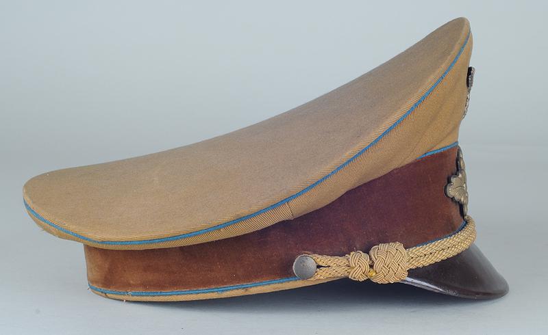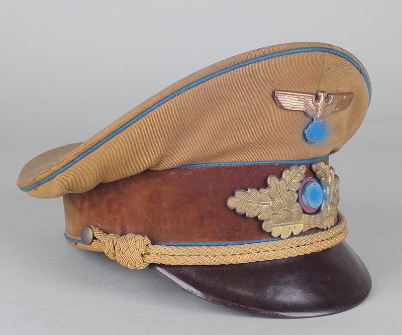 Casquette en fine tricotine brune, passepoils bleu clair, bandeau de coiffe en velours ras marron foncé (trous de mite). Aigle et feuilles de chêne en aluminium estampé doré (aigle ayant perdu sa dorure, une des pattes d'attache brisée), cocarde nationale émaillée avec croix gammée en son centre, jugulaire tressée en passementerie d'or.
