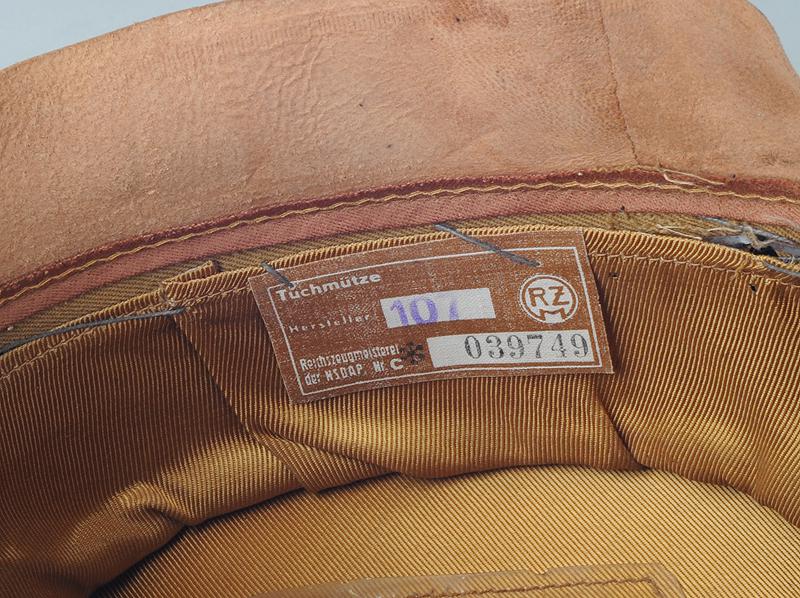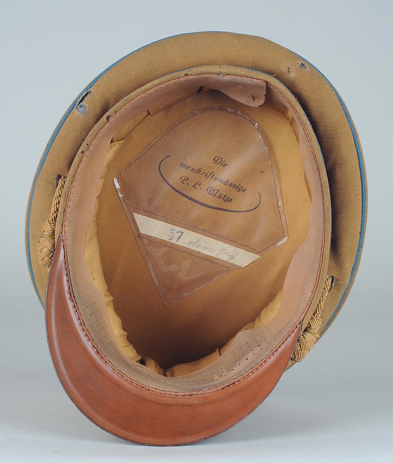 Coiffe intérieure en rayonne brune, avec son mica. Étiquette nominative avec marquage de taille «57» glissée sous le mica ; sous ce dernier, inscription en allemand attestant de la conformité de fabrication de la casquette selon les prescriptions en vigueur. Étiquette de contrôle du RZM avec code fabricant. Bandeau de transpiration en cuir. Très bon état.