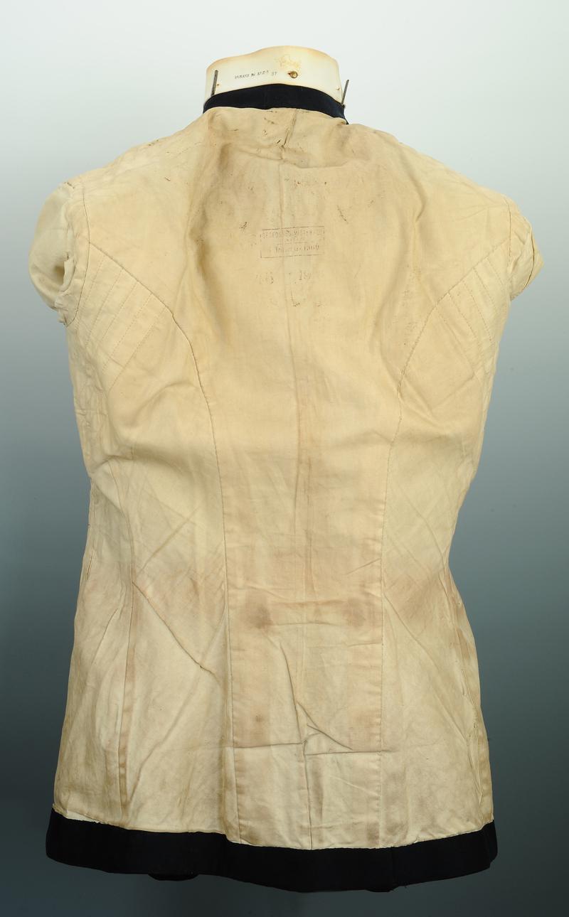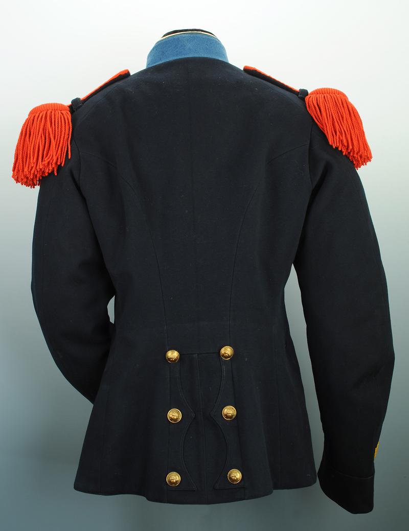 Au dos deux fausses poches avec pattes en accolades ornées de six boutons de gros modules. Au-dessus des revers de manche, galon de grade dit à lézarde en laine jaune d’or.