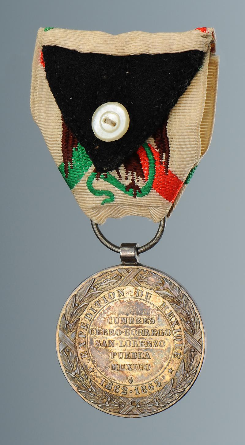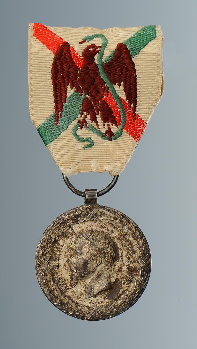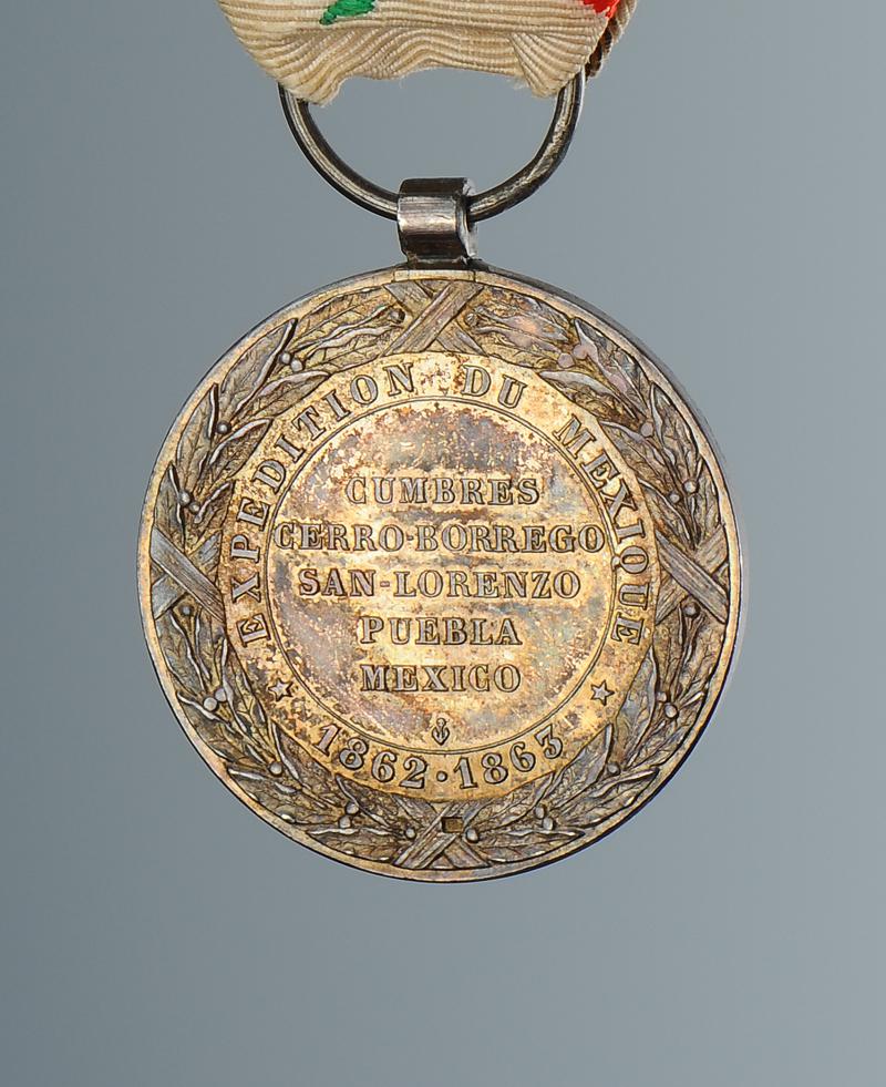 Médaille ronde en argent, diamètre 30 mm. Gravure de Désiré-Albert Barre. Sur l’avers légende « NAPOLEON III EMPEREUR » entourant l’effigie de l’Empereur couronné. Bordé d’une couronne de laurier. Sur le revers, inscription « EXPÉDITION DU MEXIQUE 1862 – 1863 » entourant le nom des batailles de « CUMBRES, CERRO-BORREGO, SAN-LORENZO, PUEBLA, MEXICO », bordé d’une couronne de laurier.