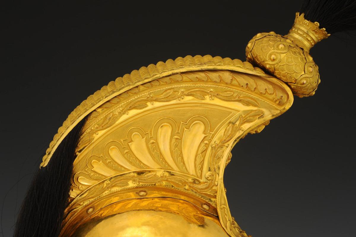 Porte aigrette composé d'une olive de H 3,5 cm, Ø 7,2 cm, formée de 7 lamelles de laiton plaquées or estampées en relief d'écailles décorées de fleurs rivetées entre elles au moyen de petites lamelles estampées en relief de deux serpents s'entrelaçant autour de quatre perles disposées verticalement ; d'une douille estampée d'une couronne de feuilles de laurier, d'une baguette de perles et surmontée d'une suite de fleurs de lys, H 2,7 cm, Ø à sa base 2,6 cm, Ø à son sommet 2,9 cm ; aigrette en crins noirs H 6,3 cm.