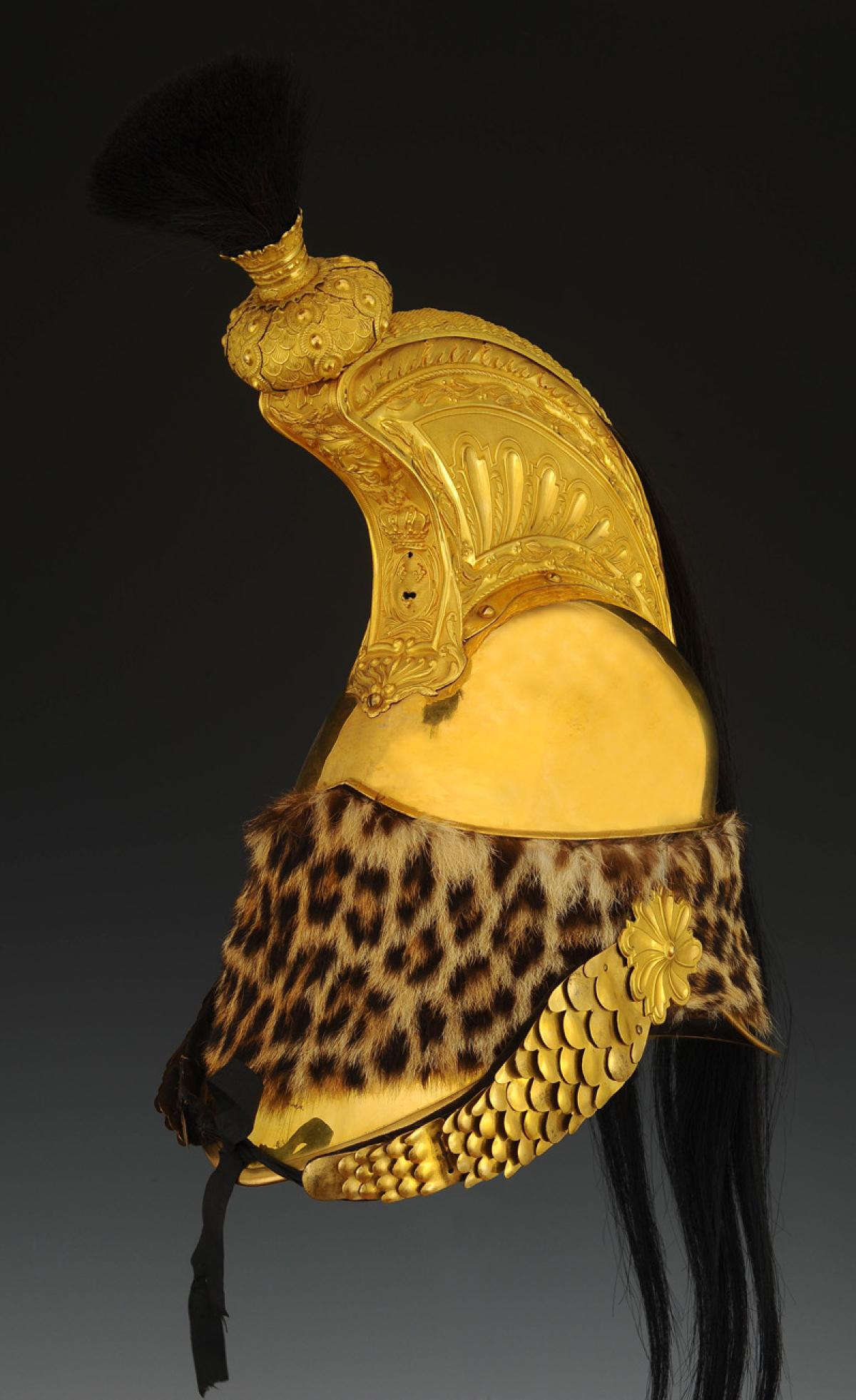 Ce casque possède le même décor des ailerons et du porte-aigrette que le casque du colonel du régiment des dragons de la Garde Impériale modèle 1806.