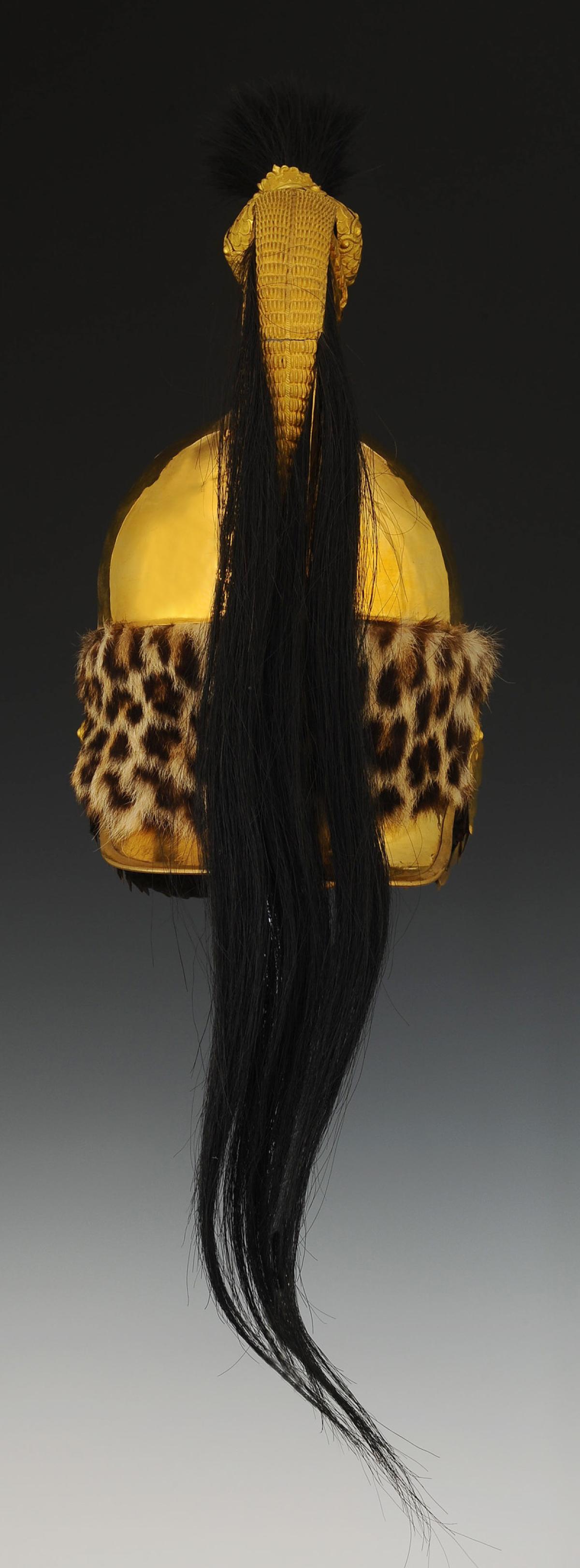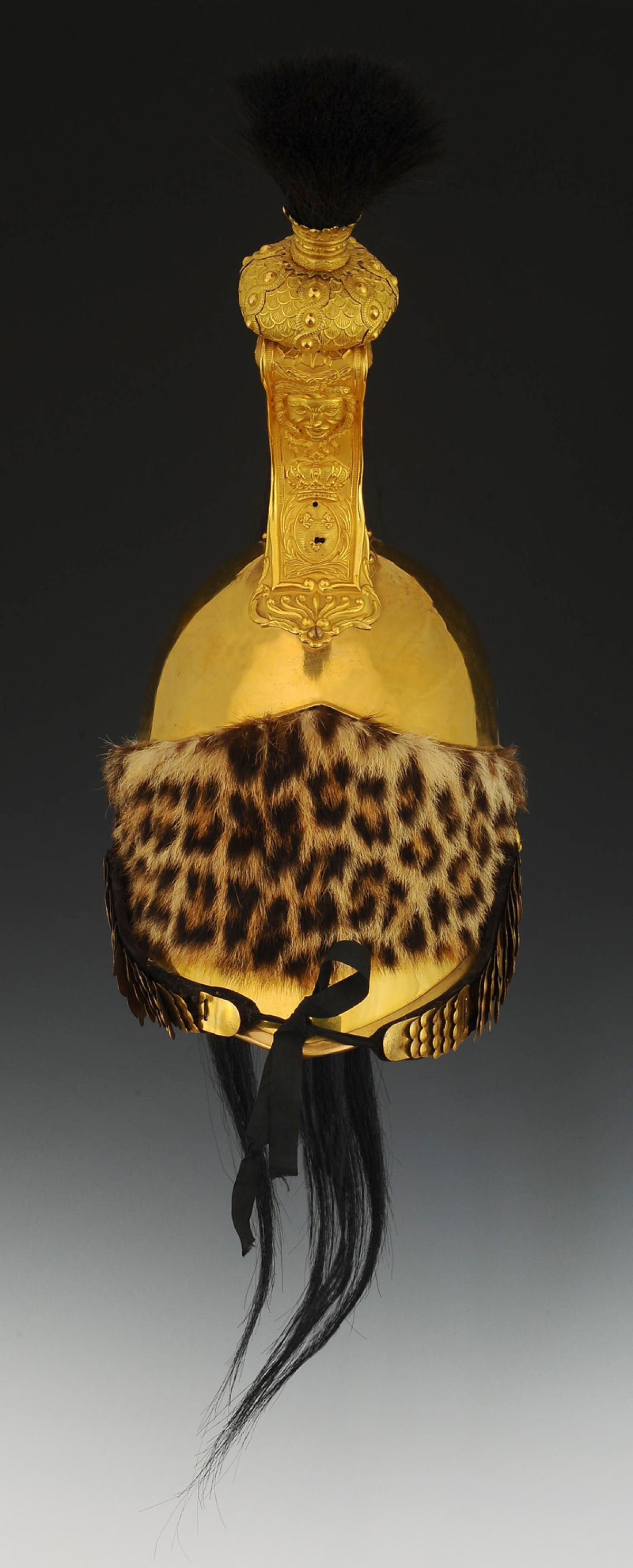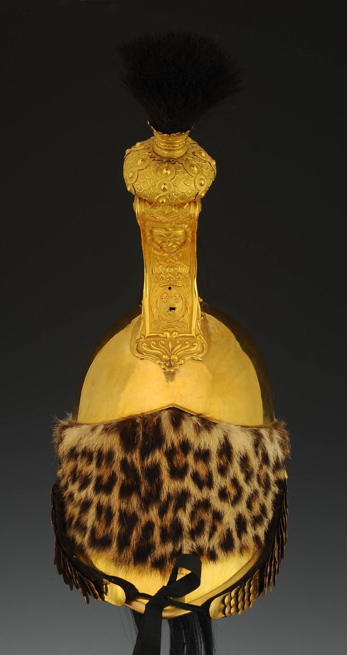 Turban se composant d’un bandeau de cuir, renforcé par des lames de métal poli, d’environ 10 cm de haut à l’avant et de 7 cm sur les côtés au niveau des rosaces et 9 cm à l’arrière, recouvert d'une peau de panthère véritable. Visière en cuivre plaqué or de 6 cm de large en partie recouverte de peau, cerclée d’un jonc en laiton doré plié à cheval sur la bordure extérieure sur une largeur de 7 mm, cousue au turban et forme son prolongement. Intérieur doublé de maroquin ciré vert. Couvre-nuque en cuivre plaqué or en partie recouvert de peau, jonc plié à cheval de façon identique à la visière, doublé à l'intérieur d'un maroquin ciré noir.